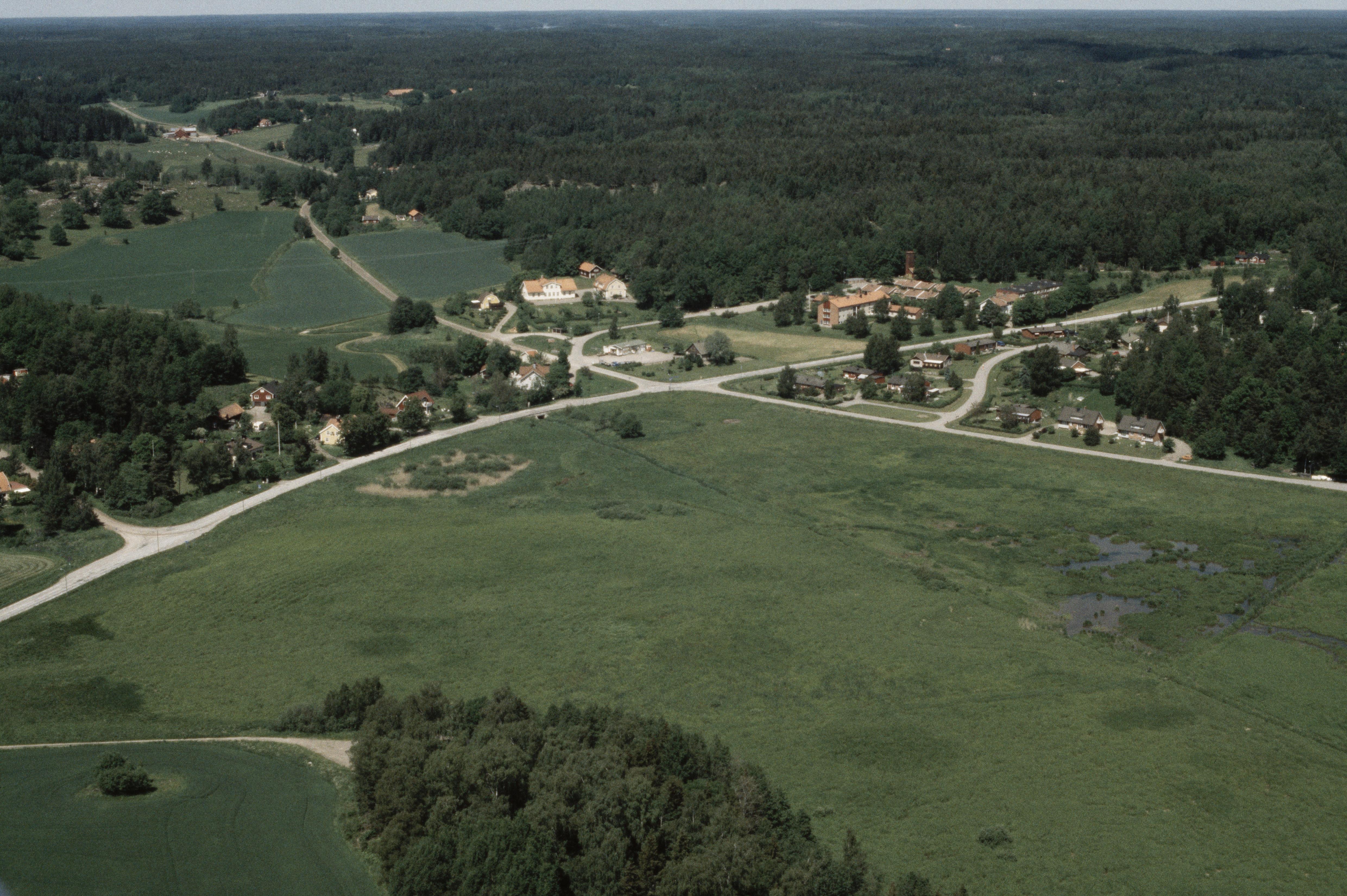 Beskrivning: Aspa gästgivaregård till vänster om bildens mitt. Nere till vänster Tingshögen RAÄnr Ludgo 62:1. I bildens övre del gränsen mellan två riksintressen, "D47 - Lid - Runtuna - Spelvik - Ludgo ? Lästringe - Bogsta" och "D43 - ?Eriksgatan? - Önnersta - Penningby". Bilden är tagen mot (väderstreck): NNV