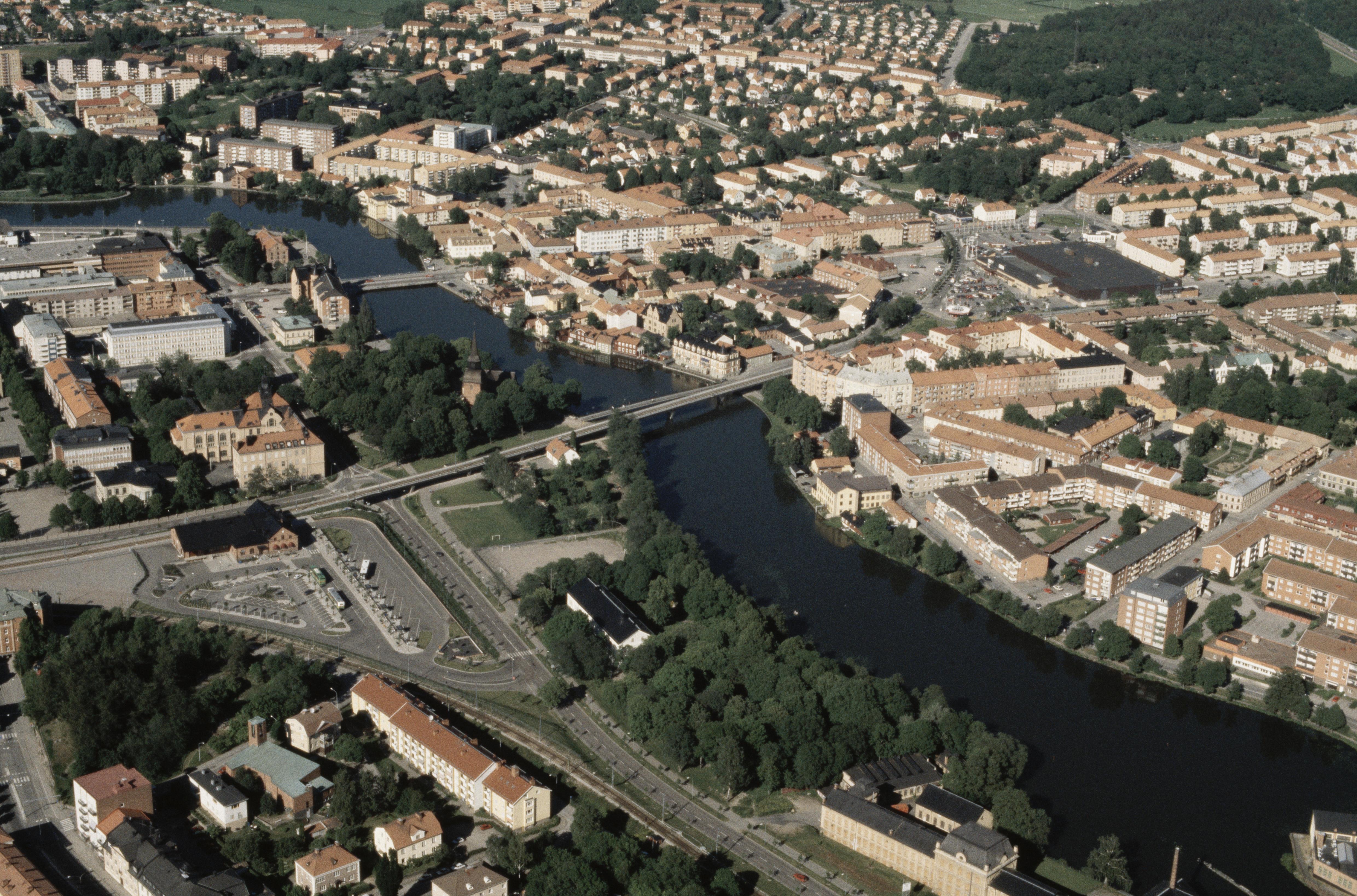 Beskrivning: Eskilstuna stad. Eskilstunaån. Fors kyrka och Gamla staden i bildens mitt. Bilden är tagen mot (väderstreck): NO
