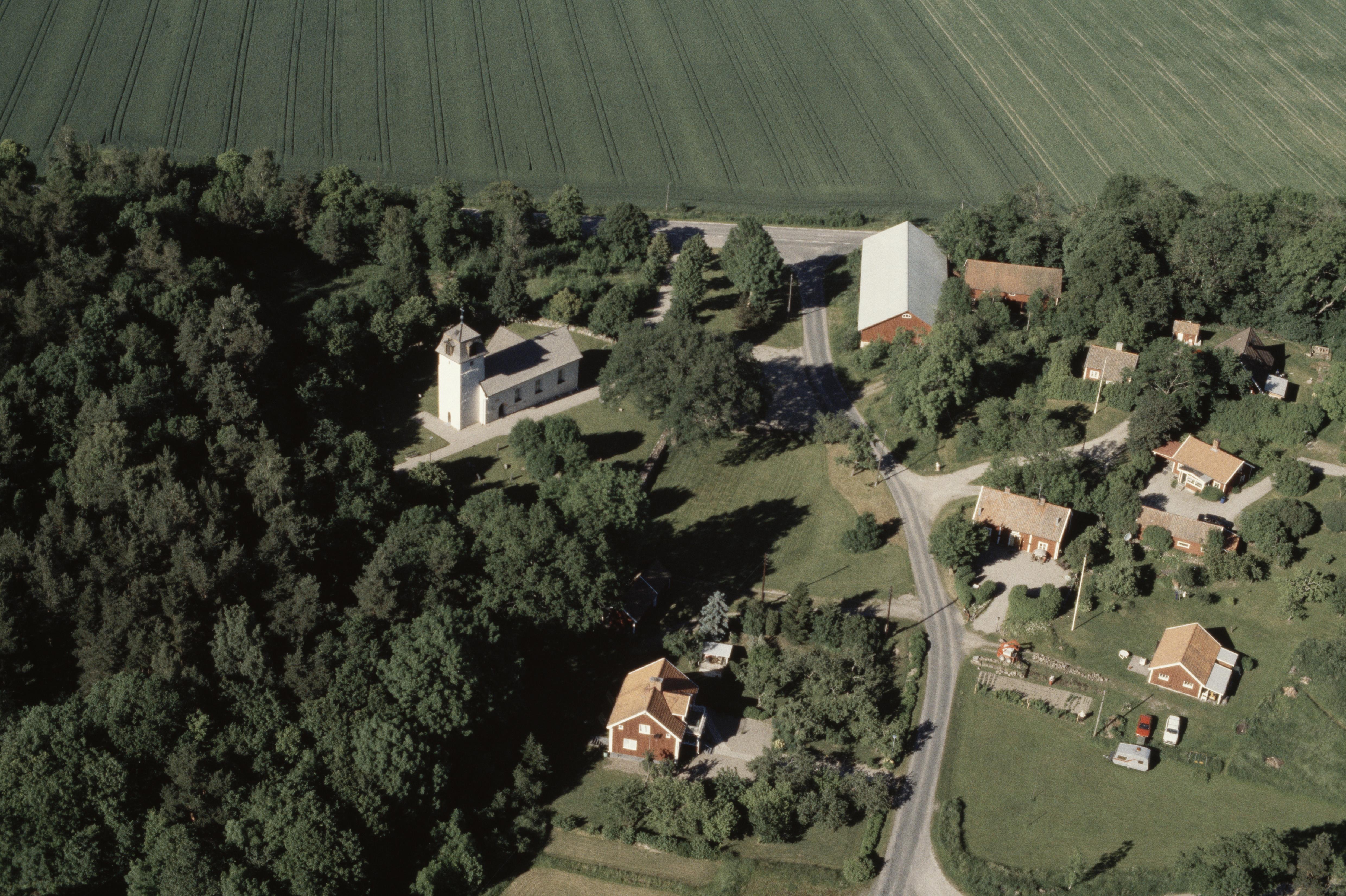 Beskrivning: Hammarby kyrka och kyrkby. Bilden är tagen mot (väderstreck): NO