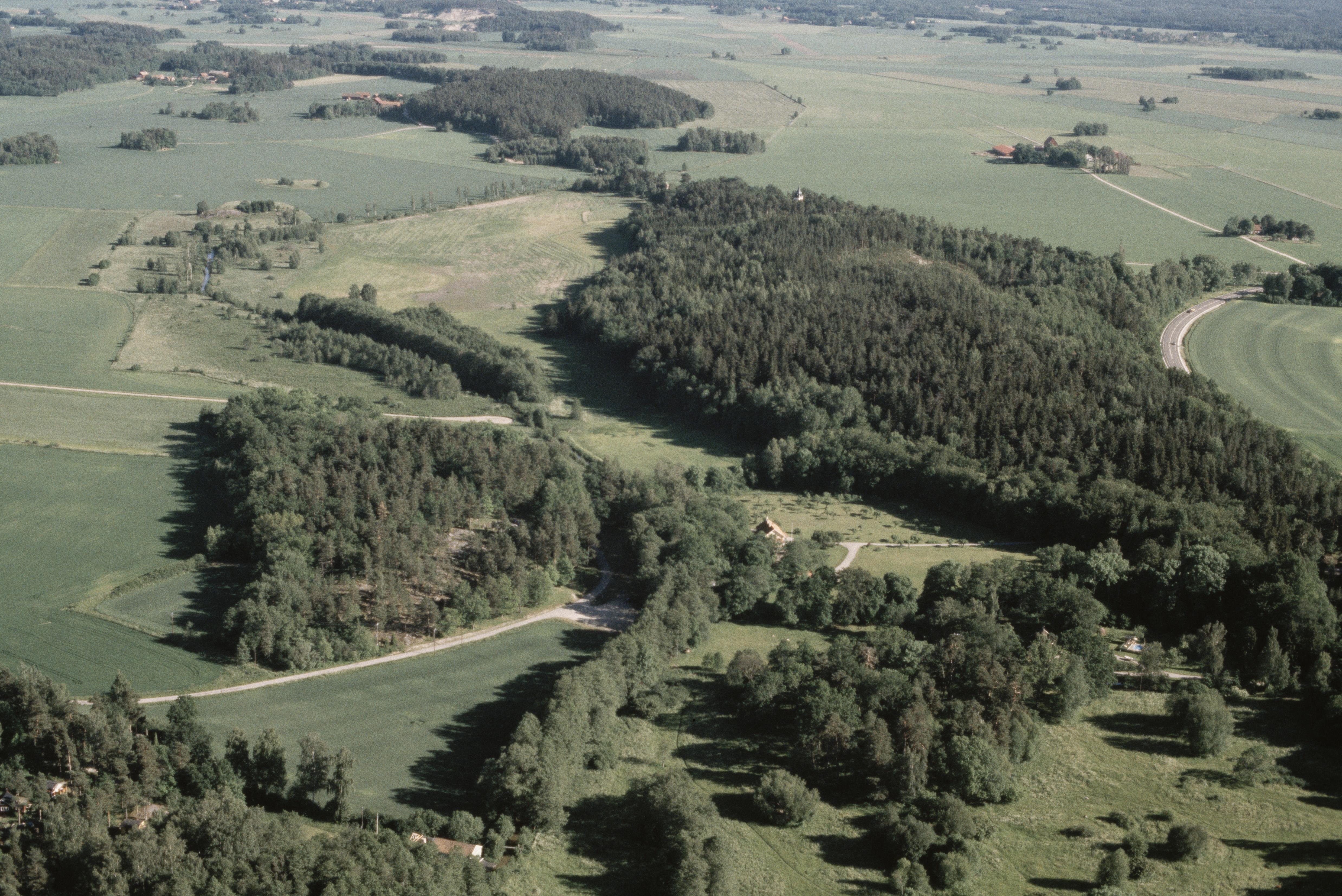 Beskrivning: Till vänster om bildens mitt gravfält RAÄnr Jäder 159:1 och runristningen Jäder 39:1 (Sö101) Sigurdsristningen / Ramsundsristningen vid Ramsundsån. Ån markerar gränsen mot socknet Sundby. Sundby kyrka skymtas bland träden uppe till vänster. Bilden är tagen mot (väderstreck): SO