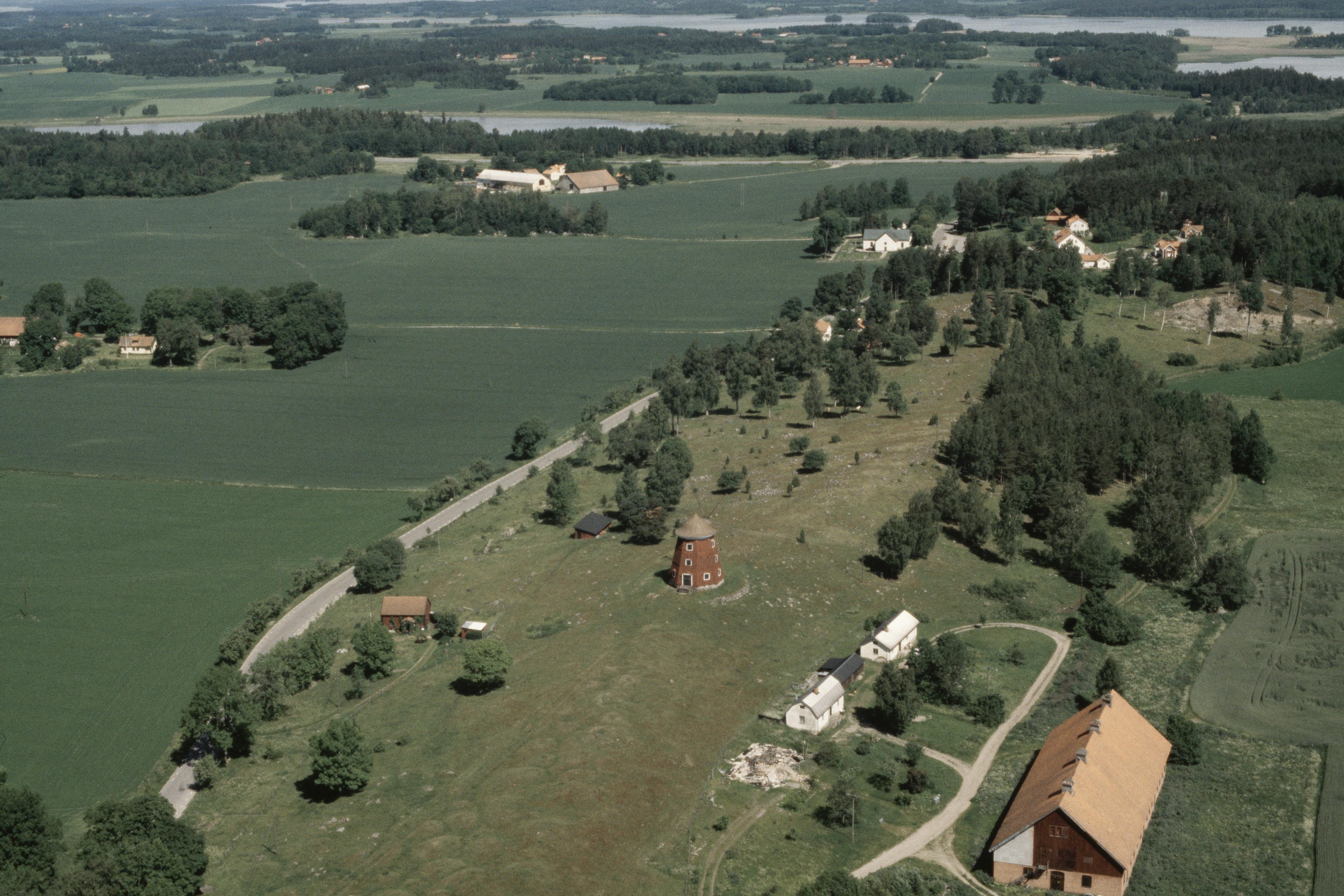 Beskrivning: Söderby herrgård med Söderby kvarn. I bildens högra del fornlämningsområde med hällristningar, boplats, gravfält, bl.a. RAÄnr Barva 39:1, 40:1, 45:1, väderkvarn Barva 95:1 m.fl. I bildens övre del Barva kyrka, Barva skola och Sörfjärden i Mälaren. Bilden är tagen mot (väderstreck): NV