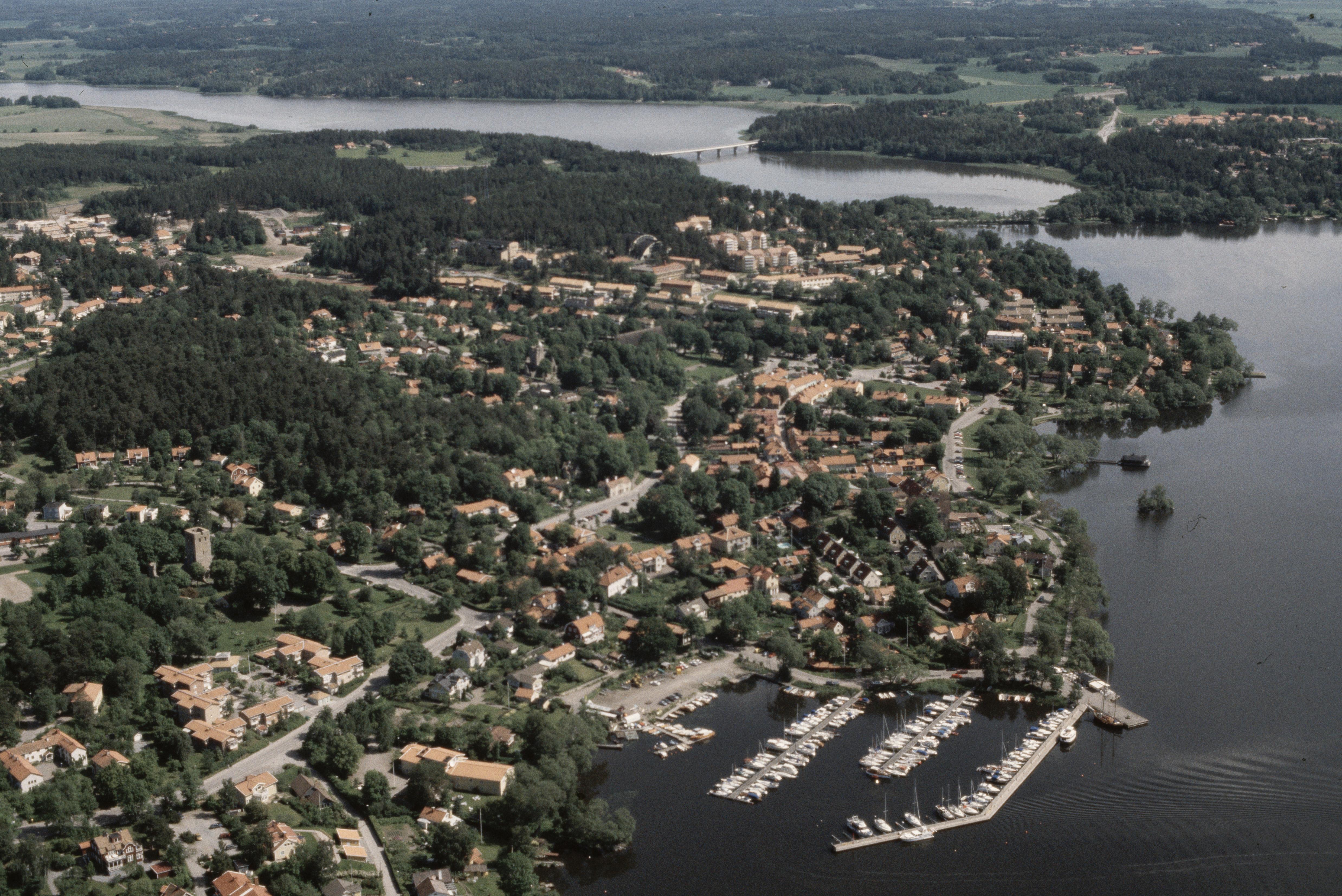 Beskrivning: Sigtuna stad vid Sigtunafjärden i Mälaren. Stadslager RAÄnr Sigtuna 195:1 m.fl. Till vänster under bildens mitt Sankt Pers kyrkoruin RAÄnr Sigtuna 22:1. Vid bildens mitt Sankt Olofs kyrkoruin RAÄnr Sigtuna 28:1 och Mariakyrkan. Bilden är tagen mot (väderstreck): NO