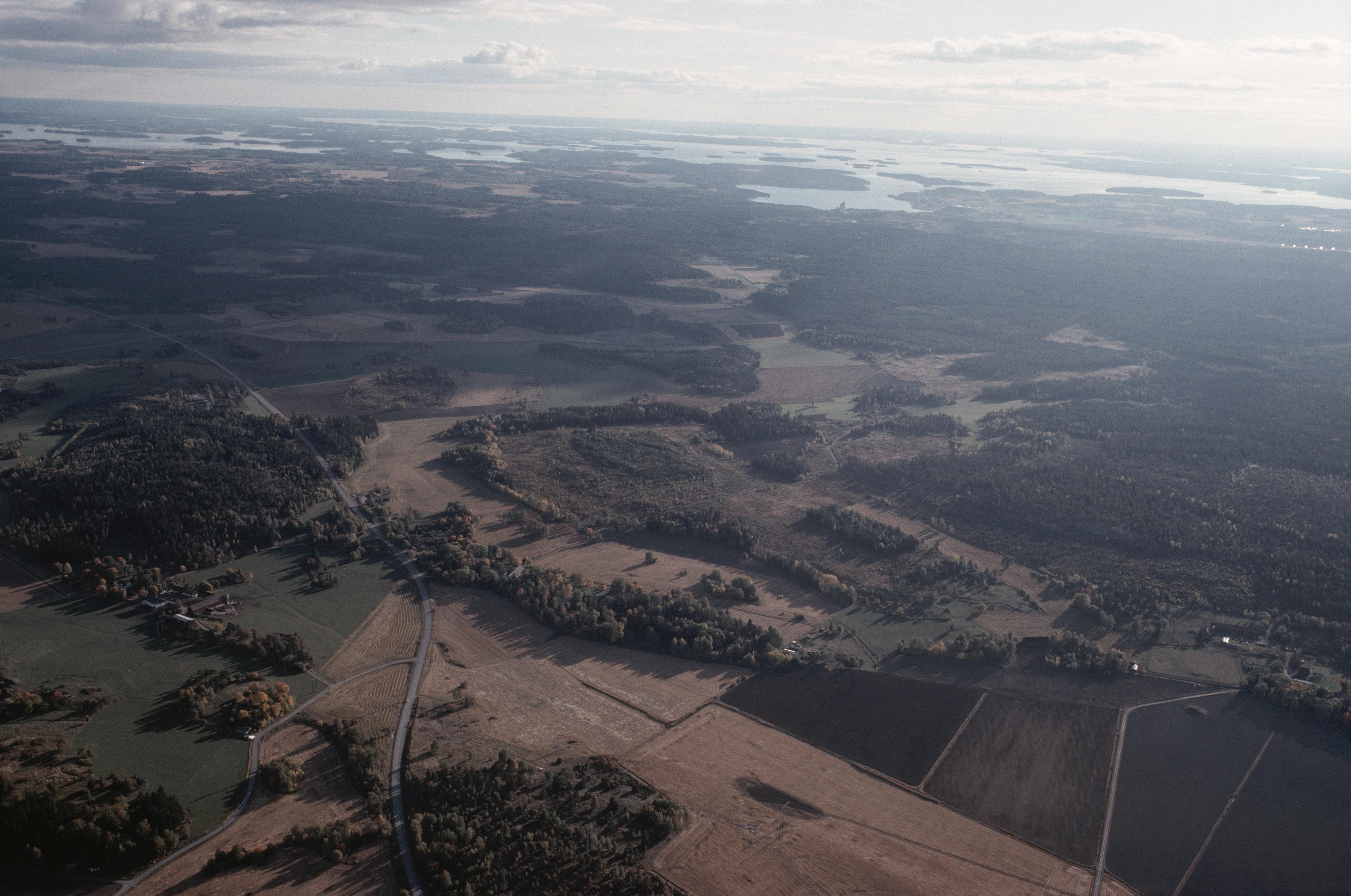 Beskrivning: Område sydväst om Håtuna kyrkby. Nere i vänstra hörnet grav- och boplats Långbacken med runristning RAÄnr Håtuna 67:1-2. I bildens övre del Håbo-Tibble socken m.fl. mot Mälaren. Bilden är tagen mot (väderstreck): SSV