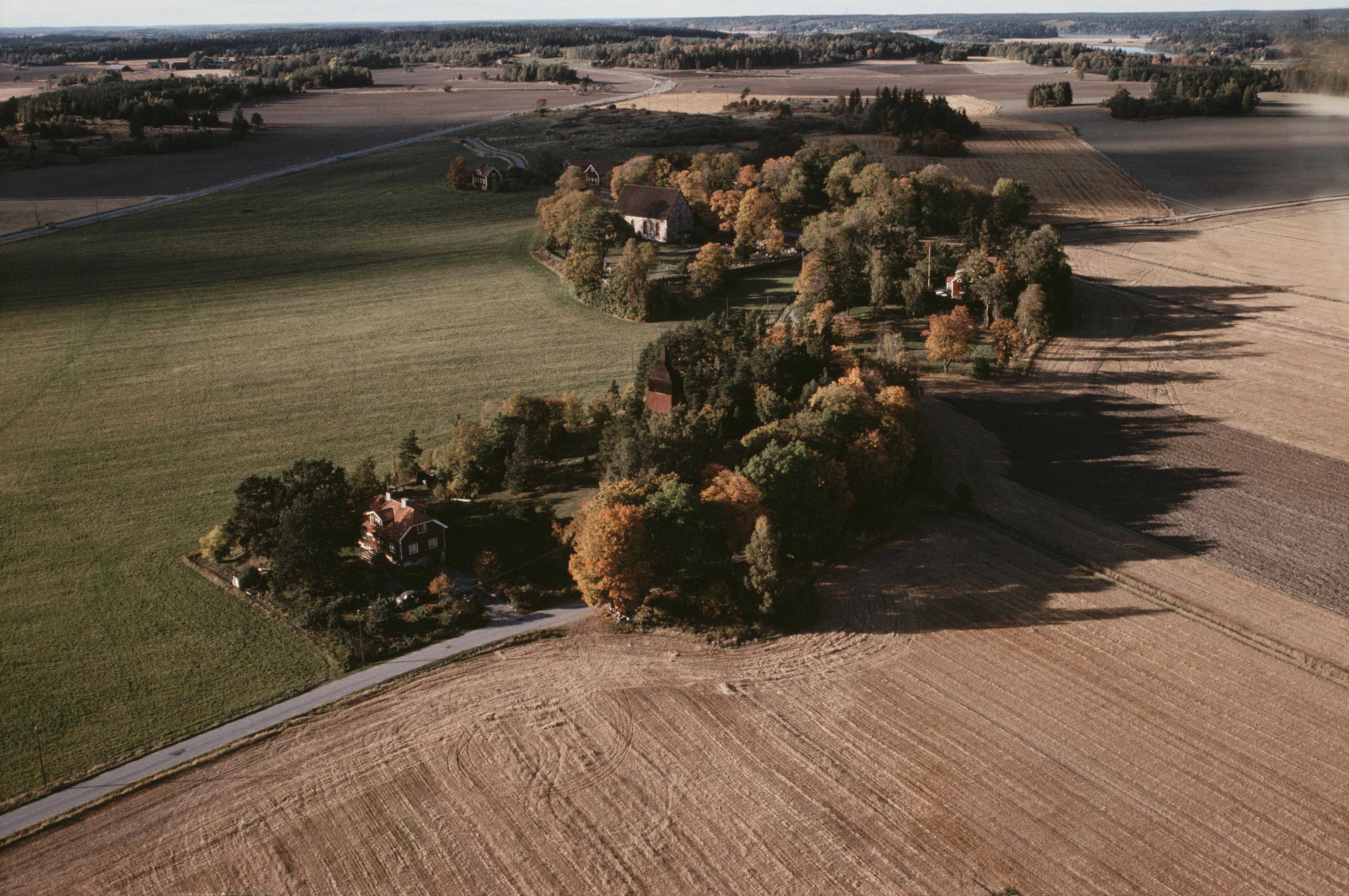 Beskrivning: Håtuna kyrka och kyrkby. Vid bildens mitt område med tegelindustri RAÄnr Håtuna 188:1. I bildens övre kant Håtunaviken i Mälaren mot socknet Sankt Per. Bilden är tagen mot (väderstreck): NV
