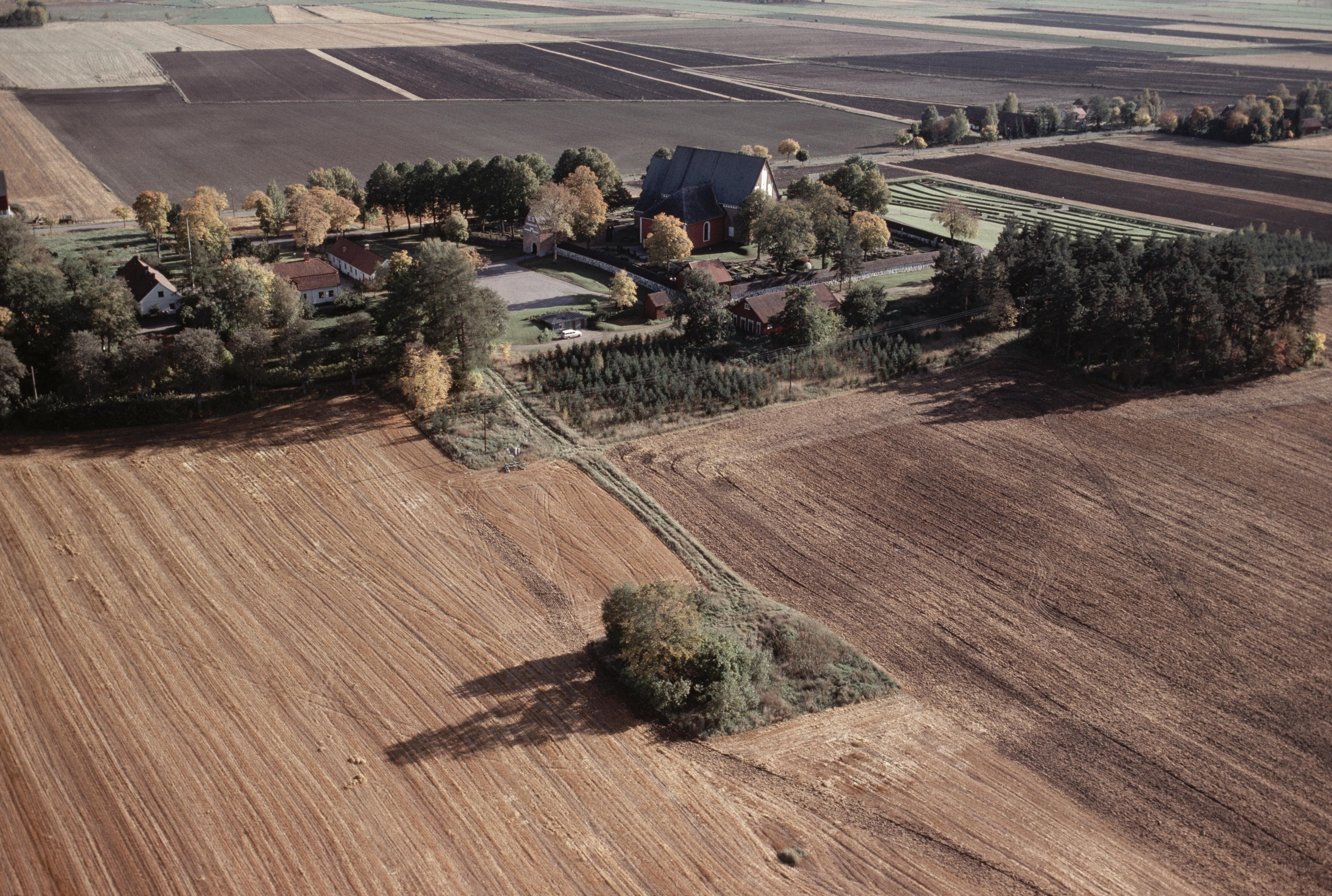 Beskrivning: Vendels prästgård och Vendels kyrka. I bildens nedre del smideslämning RAÄnr Vendel 365 och gravfält Vendel 27:1-2. Uppe till höger minnesmärke och båtgravfält RAÄnr Vendel 9:1-2. Bilden är tagen mot (väderstreck): SO