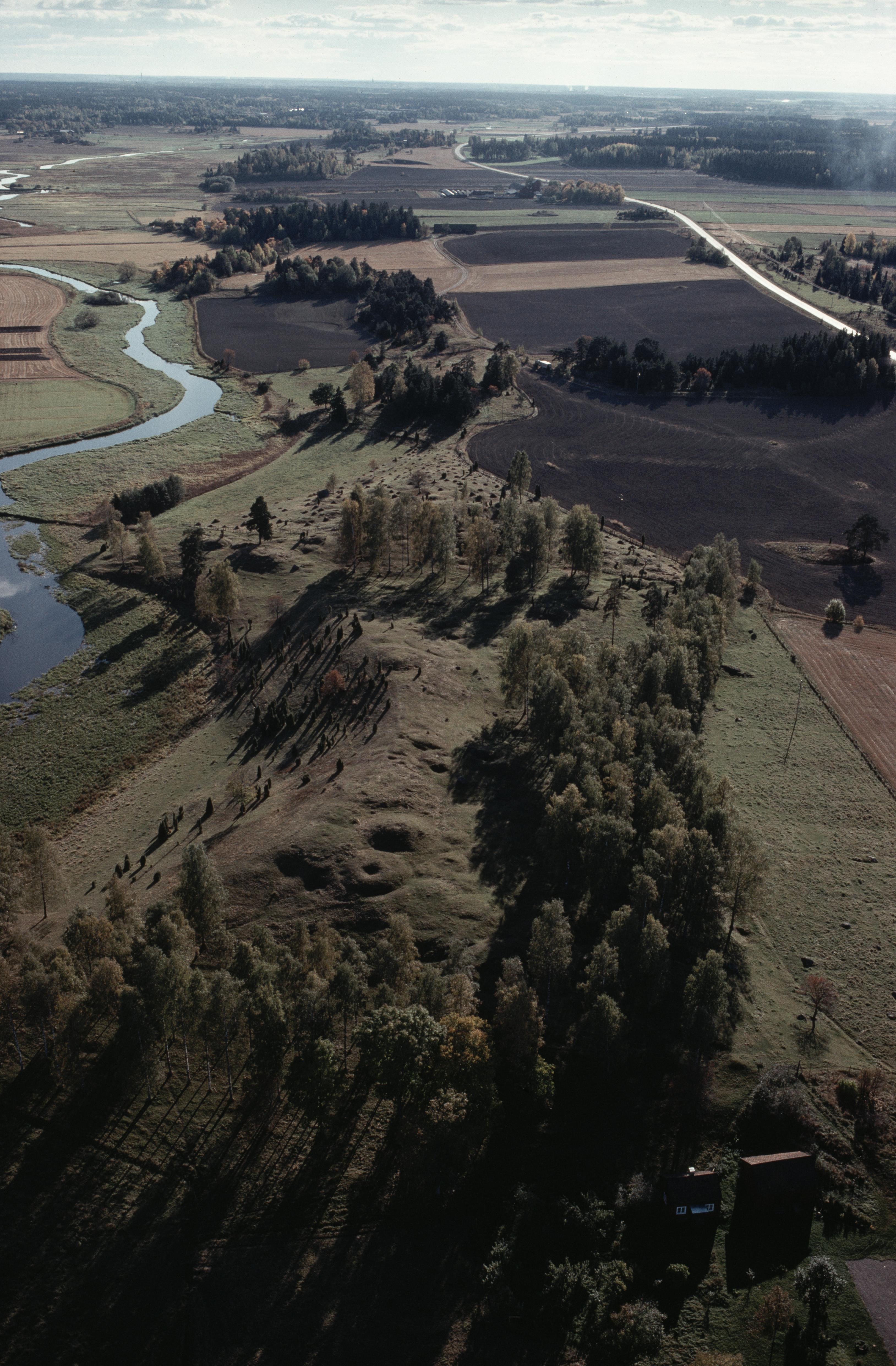 Beskrivning: Fyrisån vid Ekeby i Lena. Vid bildens mitt gravfält RAÄnr Lena 109:1 med husgrund Lena 380, bytomt Lena 575 och 835 m.fl. I bildens övre del Ånge by. Bilden är tagen mot (väderstreck): SO