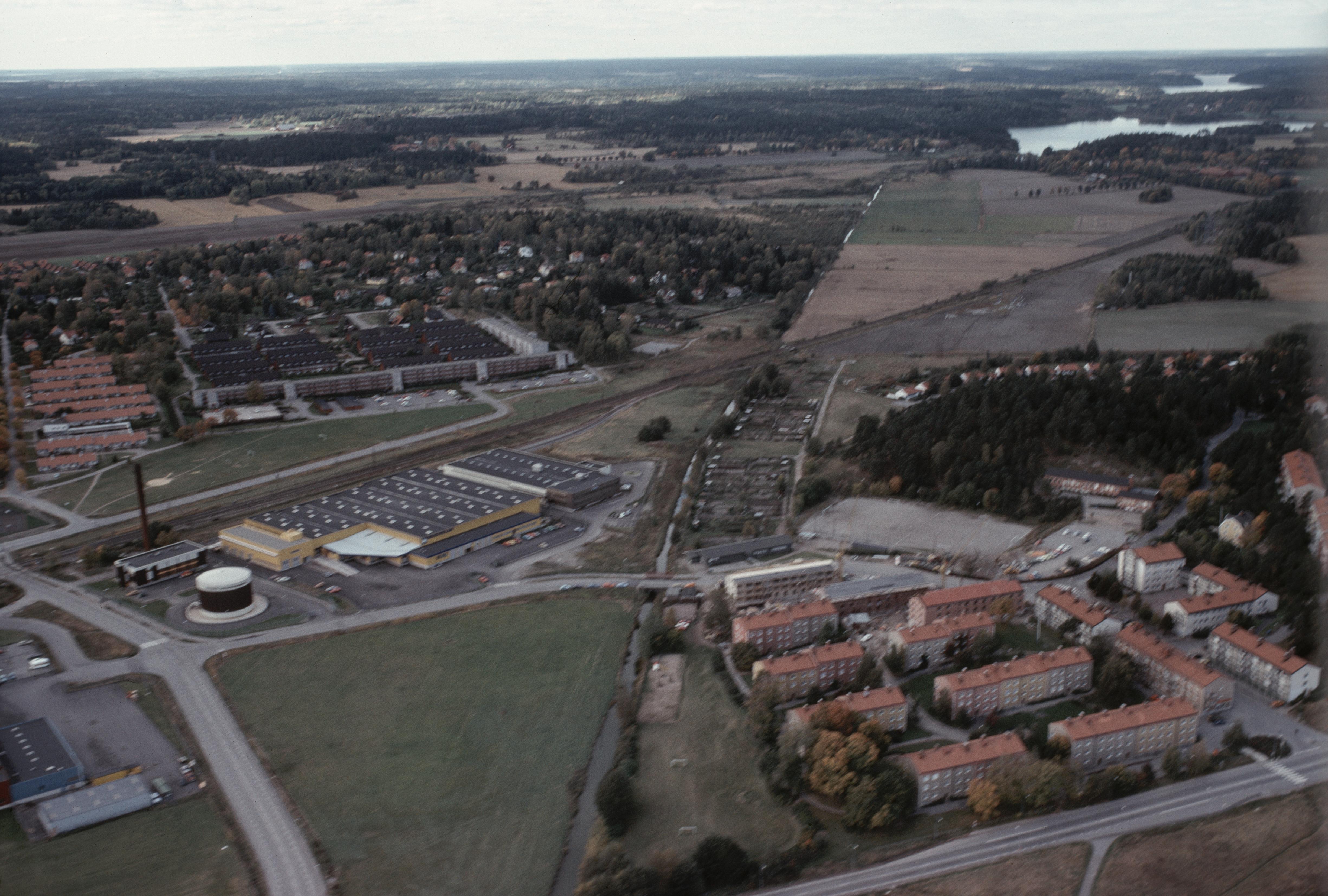 Beskrivning: Området Rotebro. Järnbanespåret korsar Edsån vid bildens mitt. Uppe till höger Edssjön. (Obs! Bilden är oskarp.) Bilden är tagen mot (väderstreck): VNV