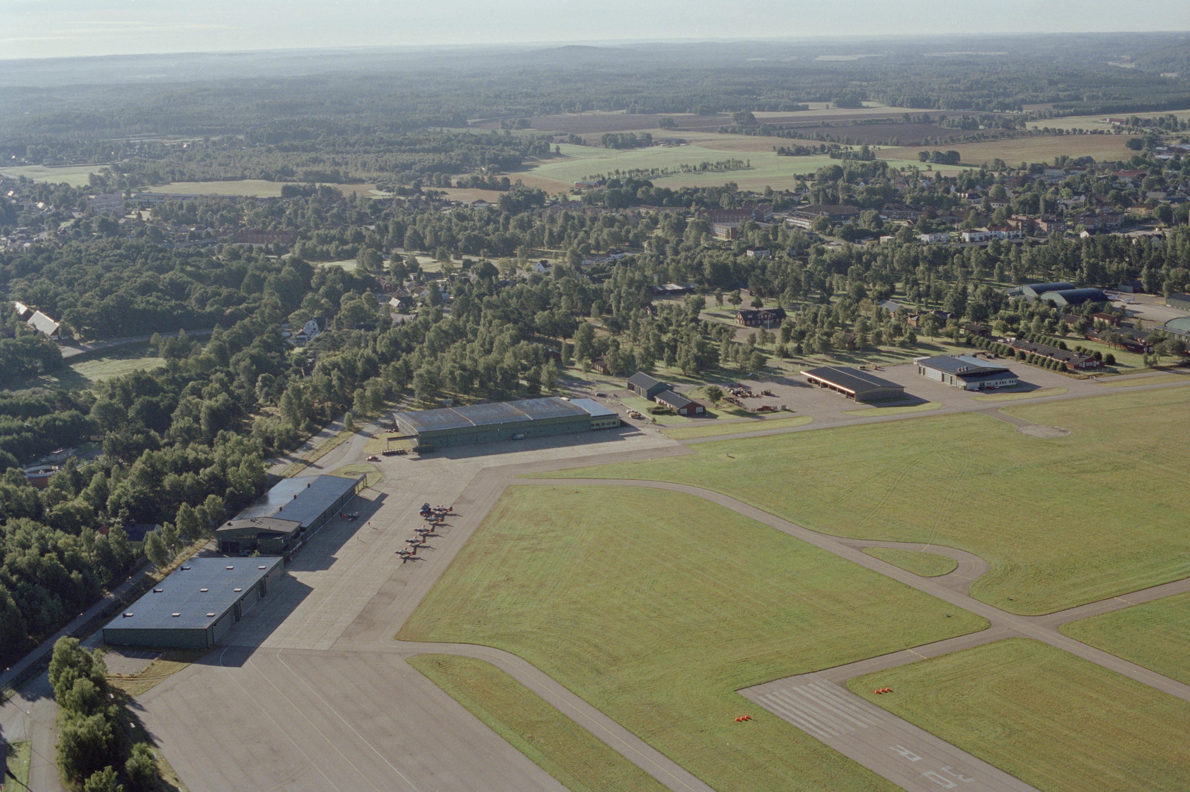 Beskrivning: Ljungbyheds flygplats, hangarbyggnader. Bilden är tagen mot (väderstreck): SO