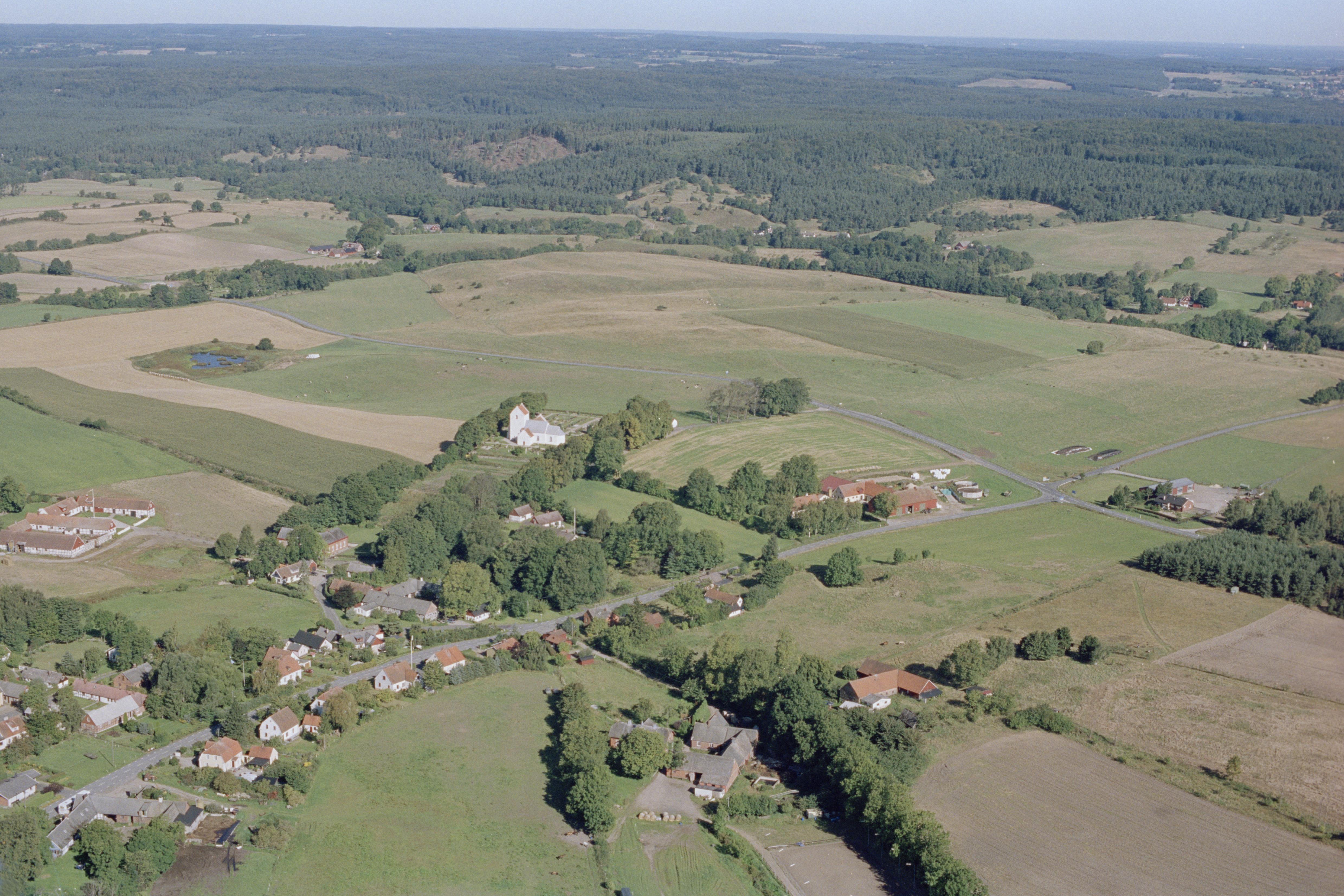 Beskrivning: Ravlunda kyrka och kyrkby. Bilden är tagen mot (väderstreck): NNV