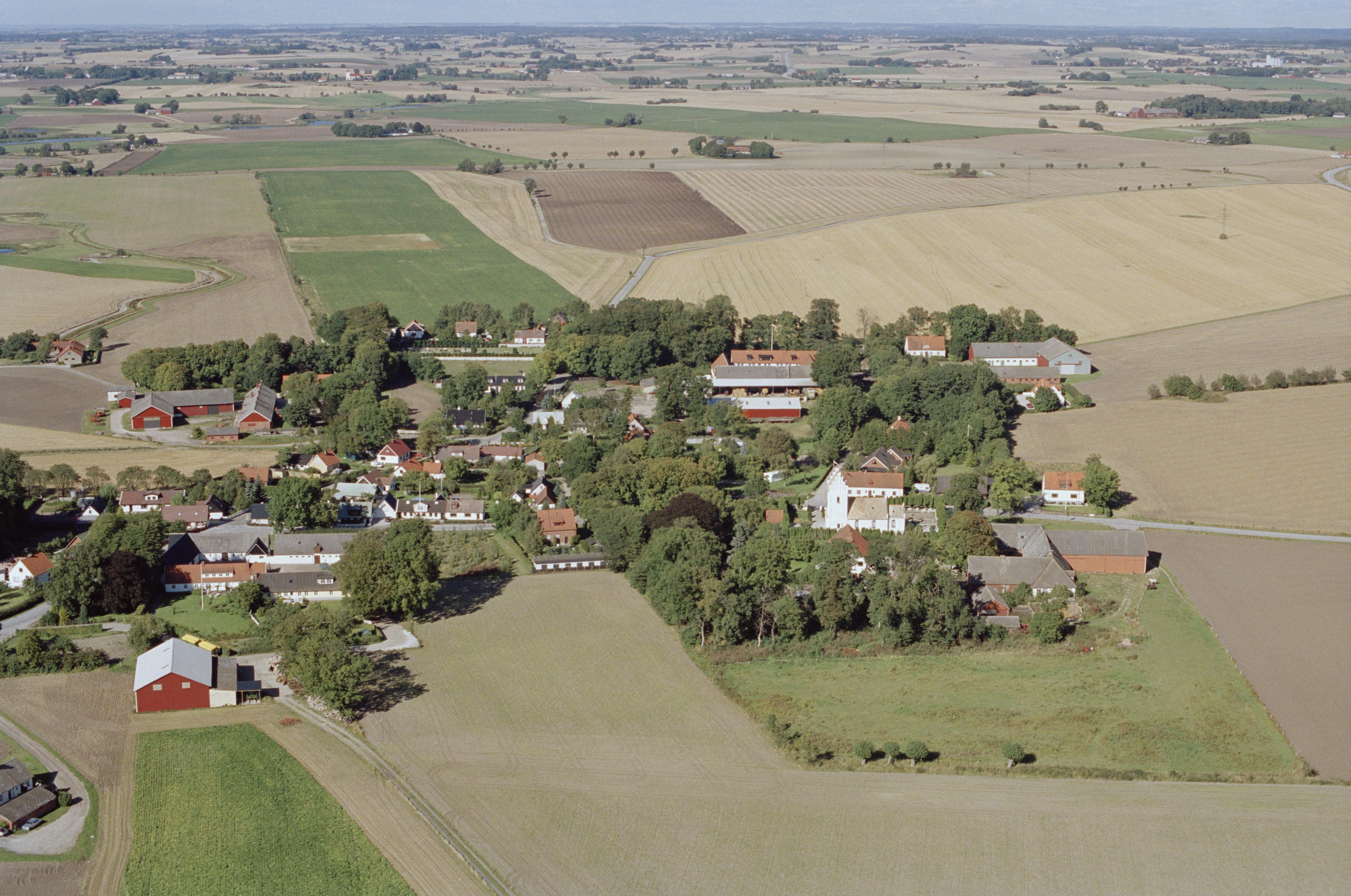 Beskrivning: Västra Vemmerlövs kyrka och kyrkby. Bilden är tagen mot (väderstreck): NO