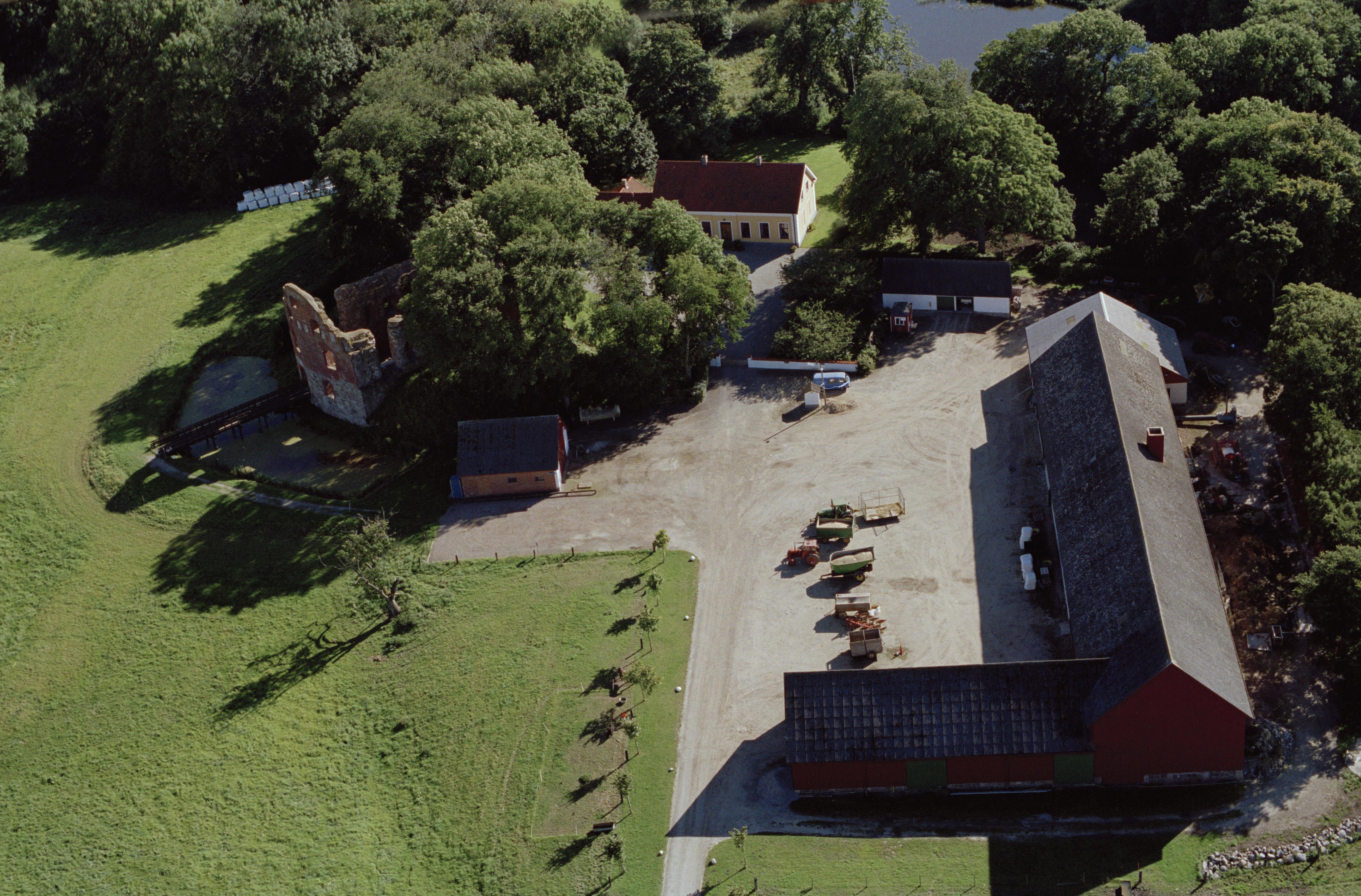 Beskrivning: Månstorps kungsgård / Månstorps herrgård och slottsruinen Månstorps gavlar RAÄnr Västra Ingelstad 1:1. I bildens övre del Östra Grevie socken. Bilden är tagen mot (väderstreck): S