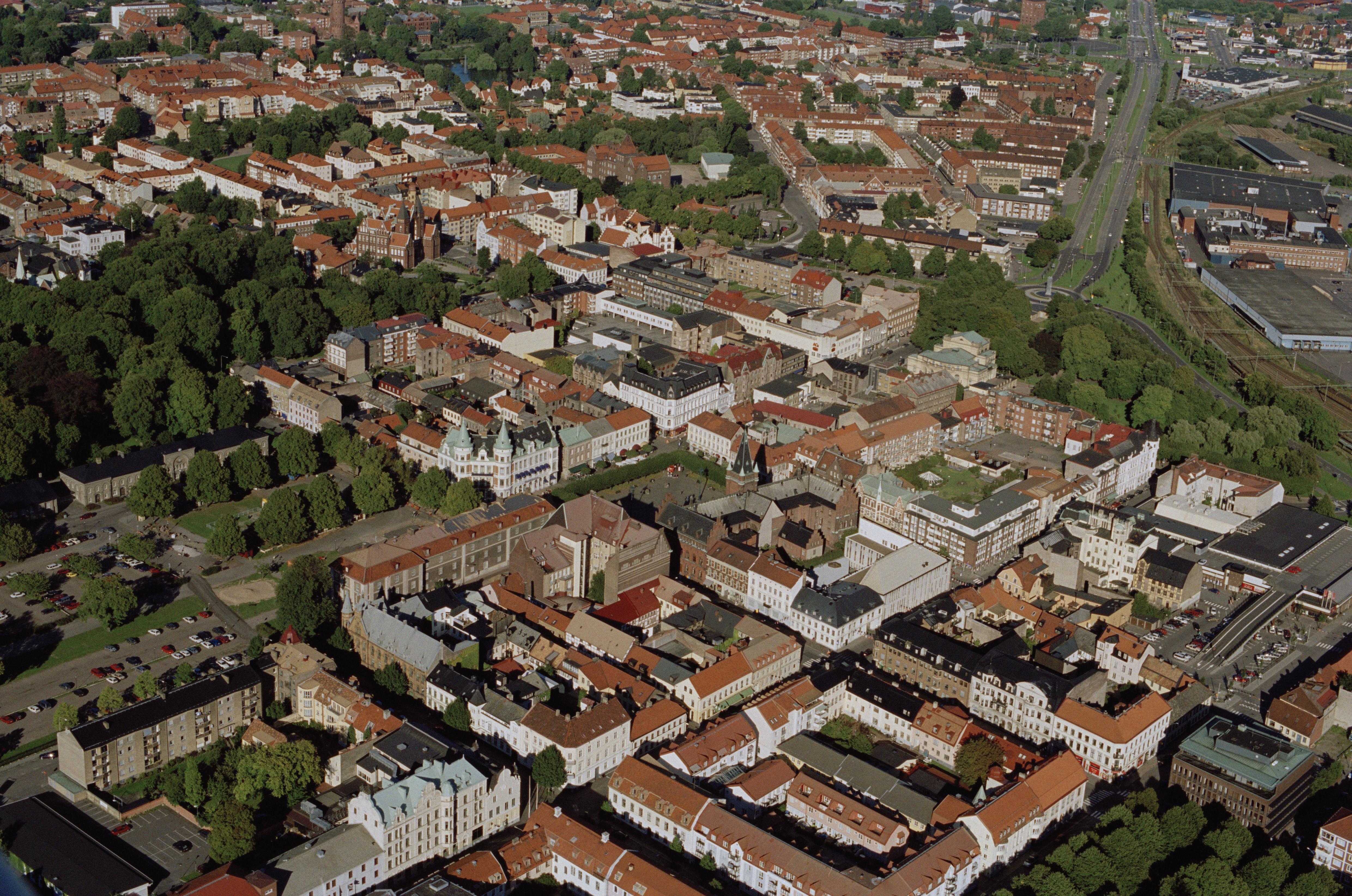 Beskrivning: Landskrona stad. Rådhustorget vid bildens mitt. Bilden är tagen mot (väderstreck): NO