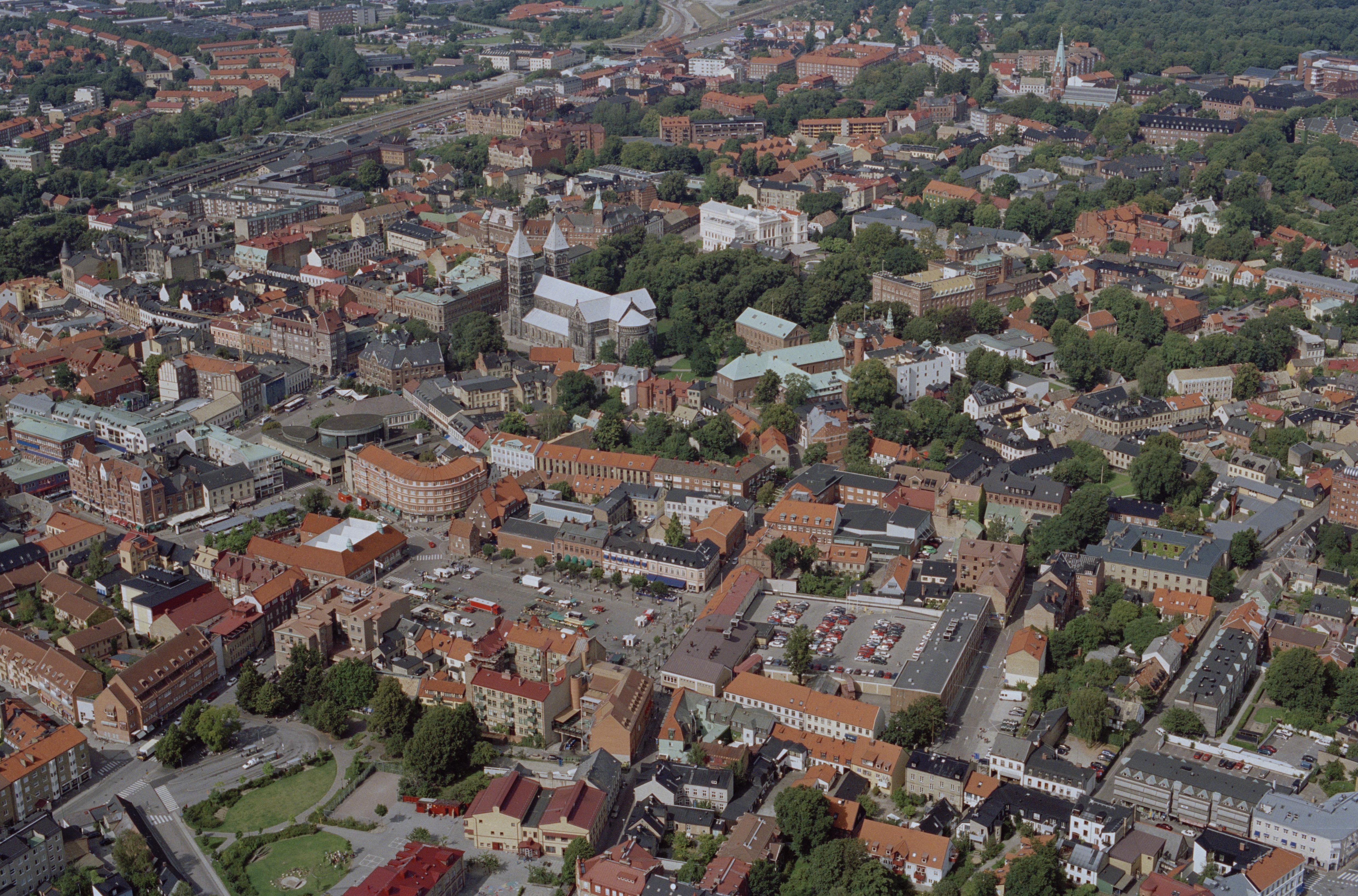 Beskrivning: Lunds stad. Lunds domkyrka vid bildens mitt. Uppe till höger Allhelgonakyrkan. Bilden är tagen mot (väderstreck): NV