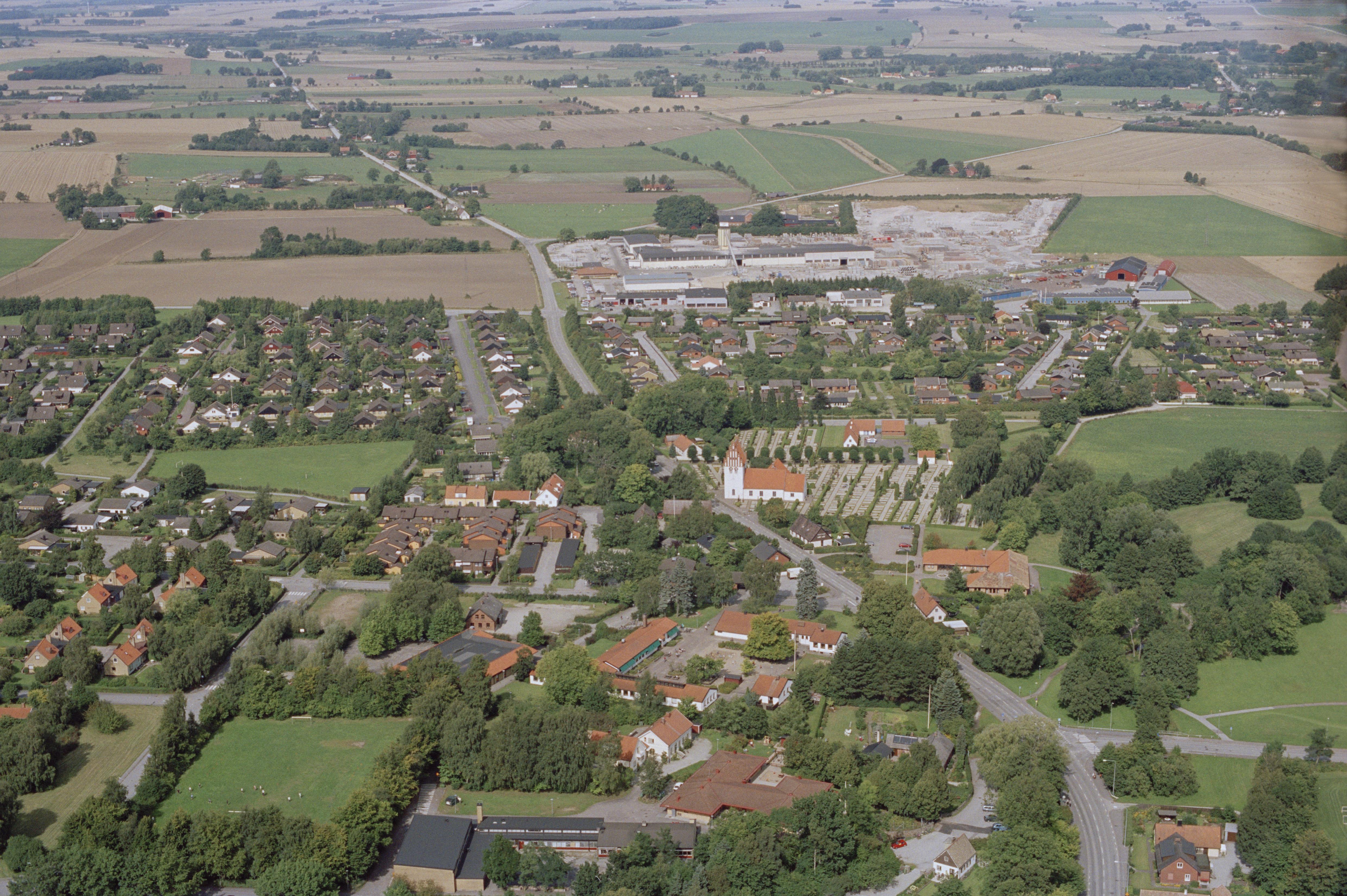 Beskrivning: Södra Sandby tätort. Södra Sandby kyrka vid bildens mitt. Bilden är tagen mot (väderstreck): NNV