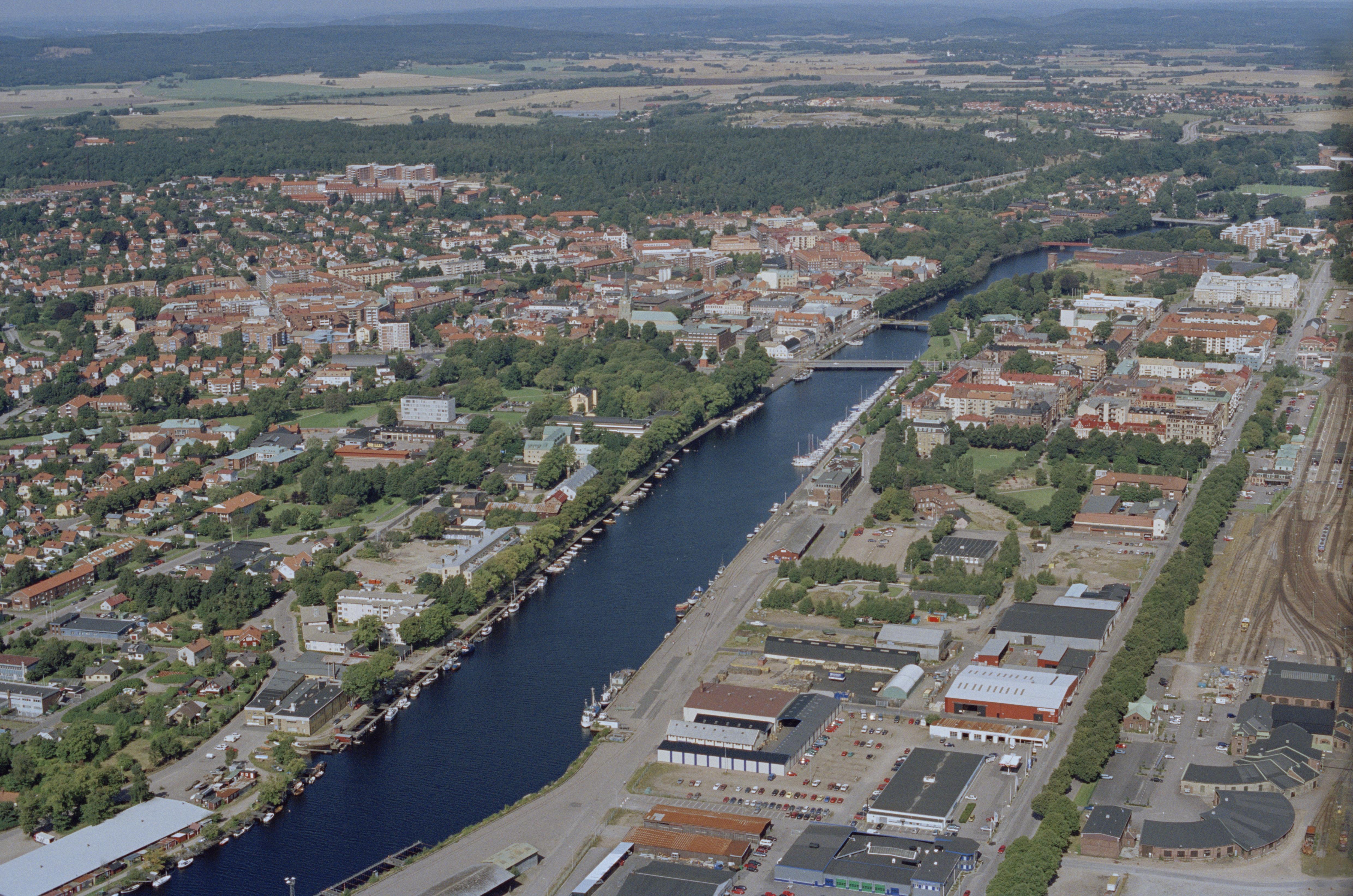 Beskrivning: Ån Nissan i Halmstads stad. Halmstads slott och Sankt Nikolai kyrka vid bildens mitt. Bilden är tagen mot (väderstreck): N