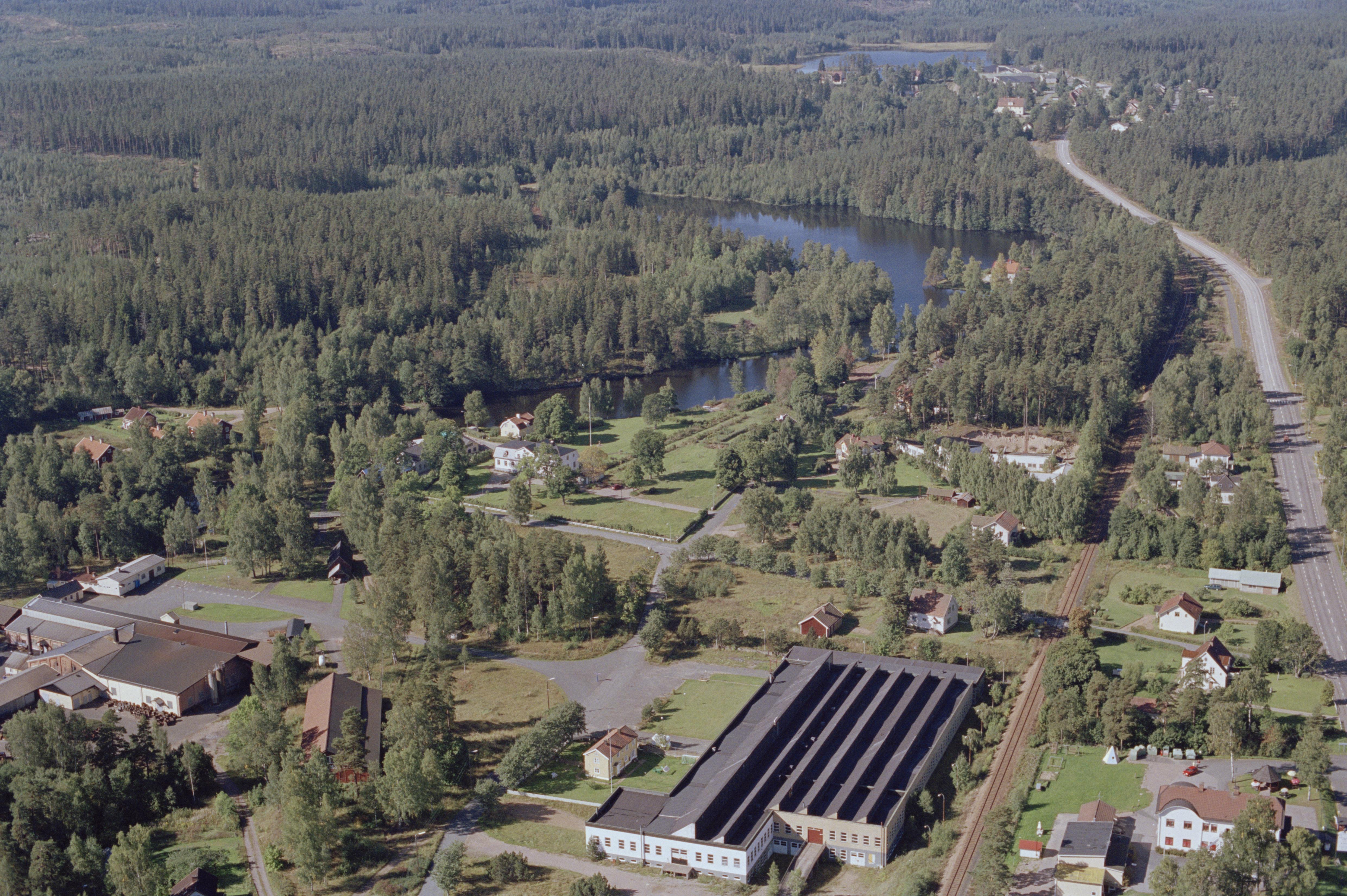 Beskrivning: Bruzaholms bruk. Bruzaholms herrgård till vänster vid bildens mitt. Järnbanespåret genom Bruzaholm. Stuveryd i bildens övre del. Bilden är tagen mot (väderstreck): SV