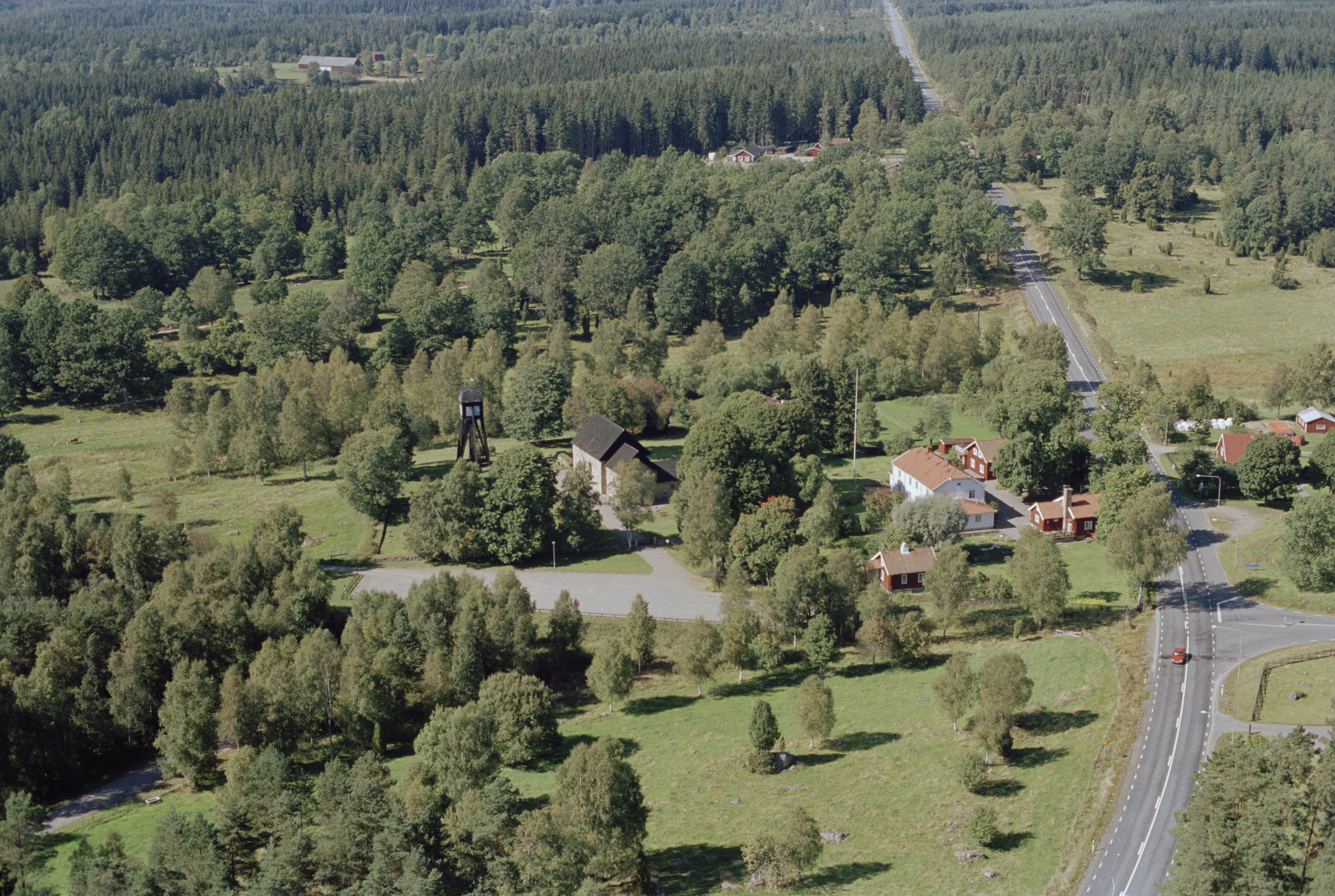 Beskrivning: Hjälmseryds gamla kyrka RAÄnr Hjälmseryd 58:1 bland träden till höger vid bildens mitt. Bilden är tagen mot (väderstreck): V