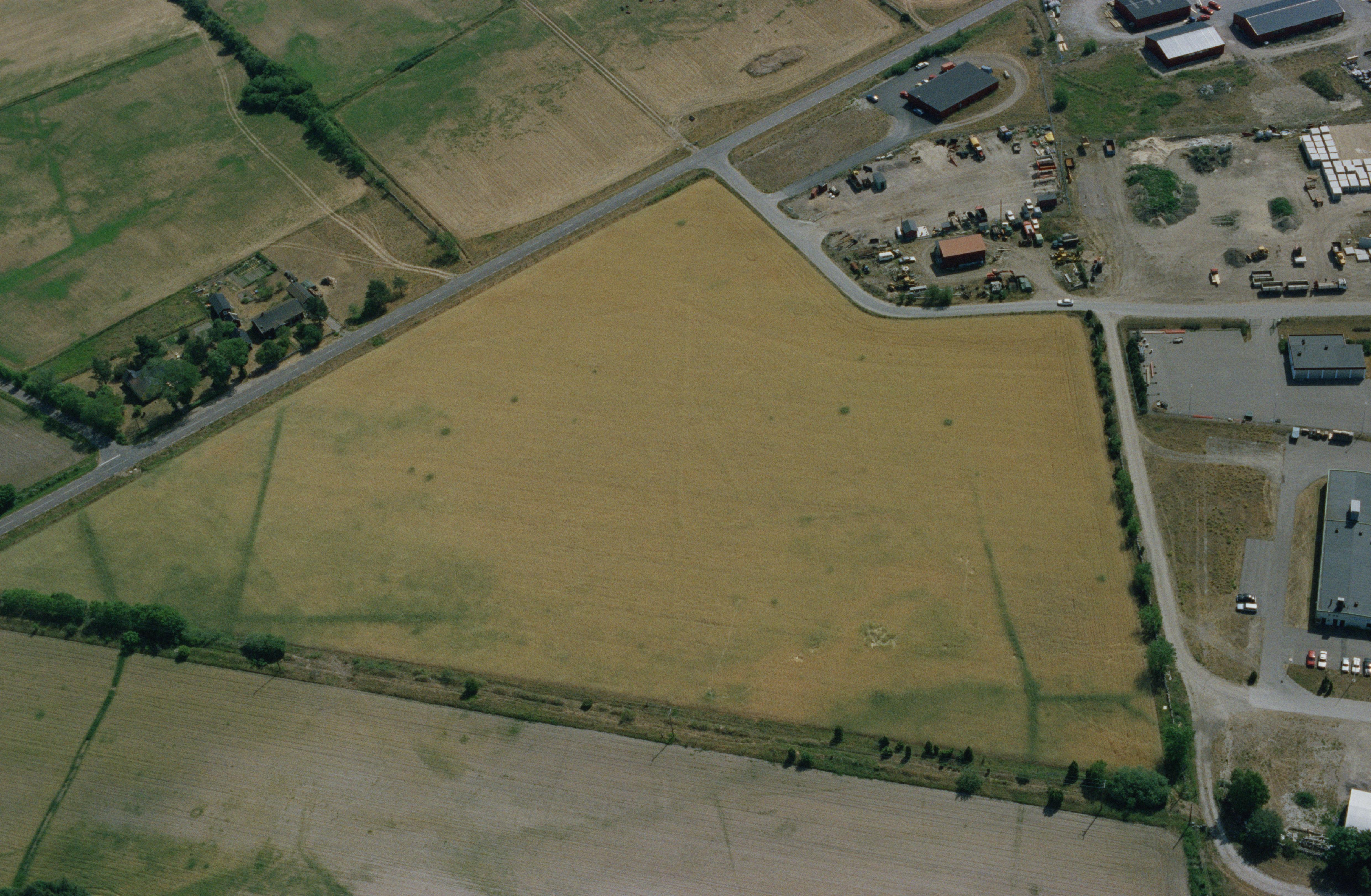 Beskrivning: Cropmarks i åker vid härd RAÄnr Högby 257. Bilden är tagen mot (väderstreck): N
