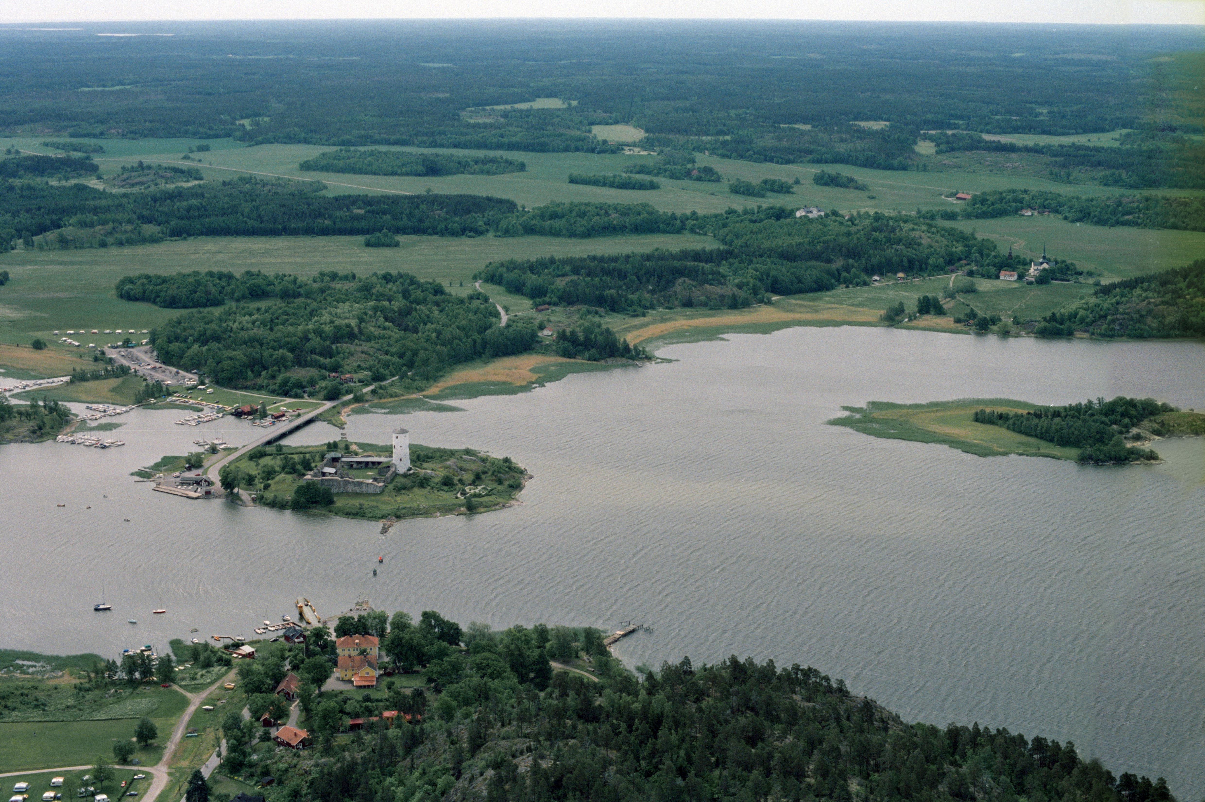 Beskrivning: Havsviken Slätbaken. Stegeborgs slottsruin RAÄnr Skällvik 222:1. Bilden är tagen mot (väderstreck): SO