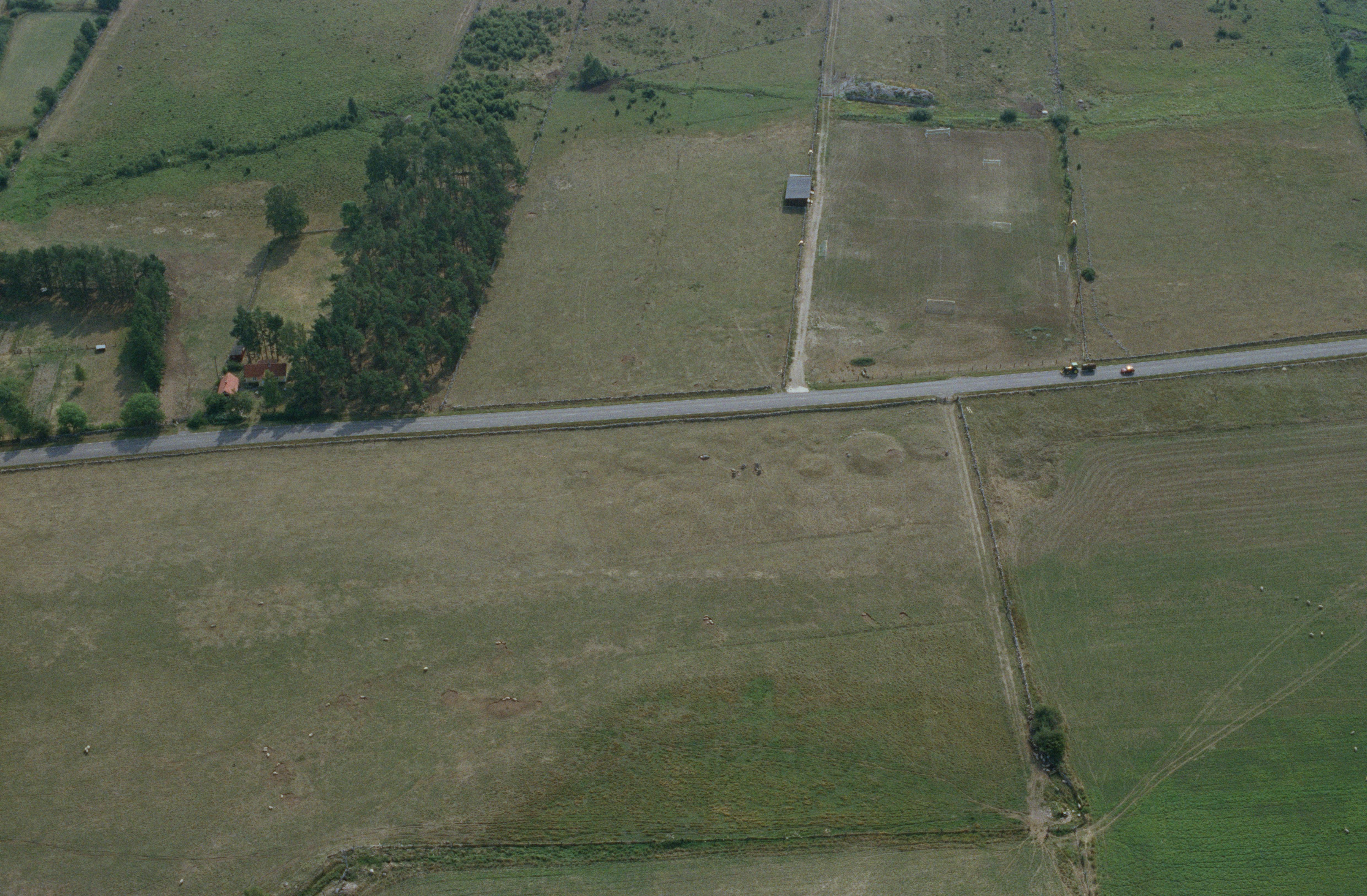 Beskrivning: Fotbollsplan till höger i bildens övre del. Gravfält RAÄnr Norra Möckleby 106:1 och 103:1 vid bildens mitt. Bilden är tagen mot (väderstreck): Ö