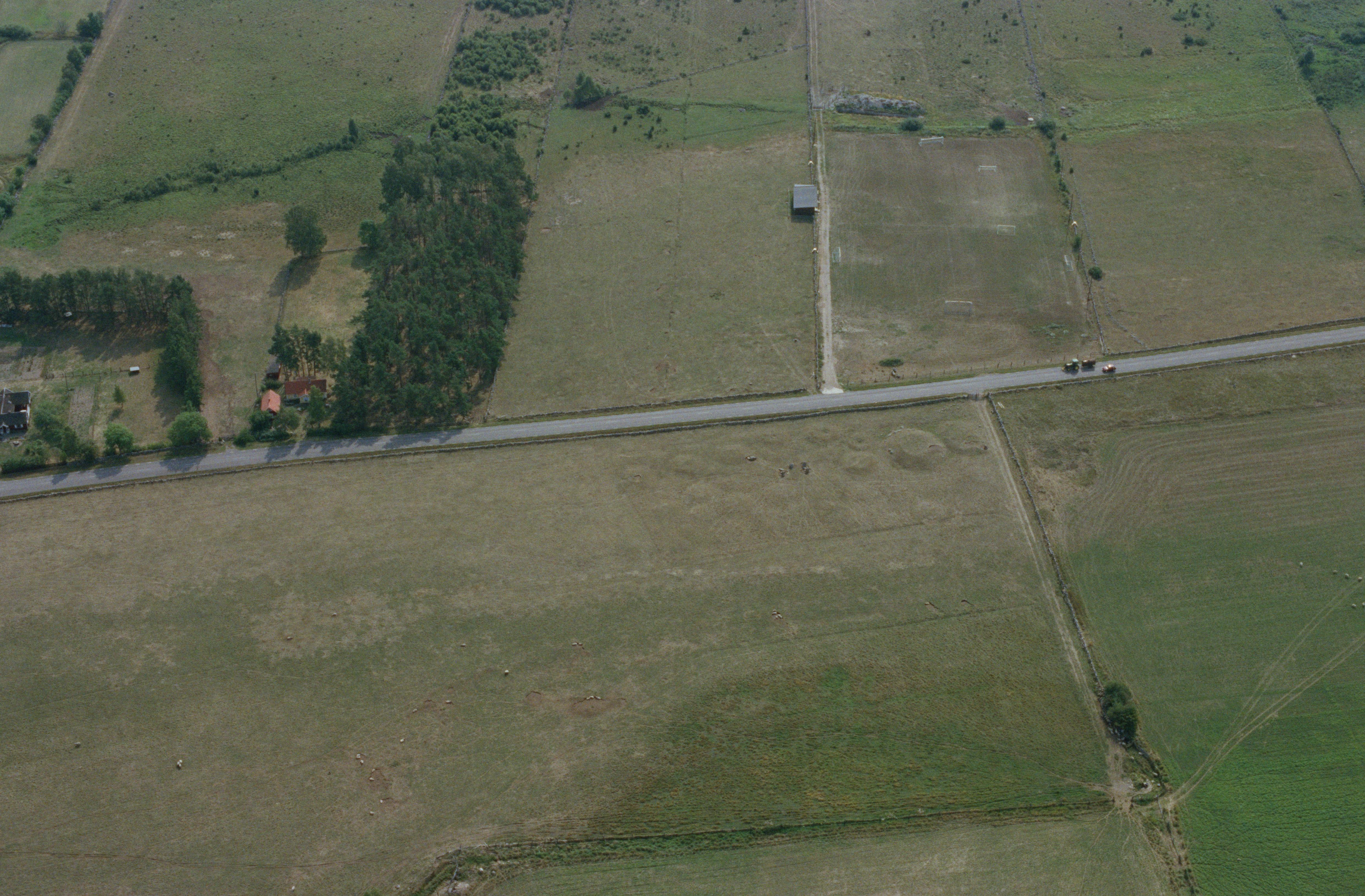Beskrivning: Fotbollsplan till höger i bildens övre del. Gravfält RAÄnr Norra Möckleby 106:1 och 103: 1 vid bildens mitt. Bilden är tagen mot (väderstreck): Ö