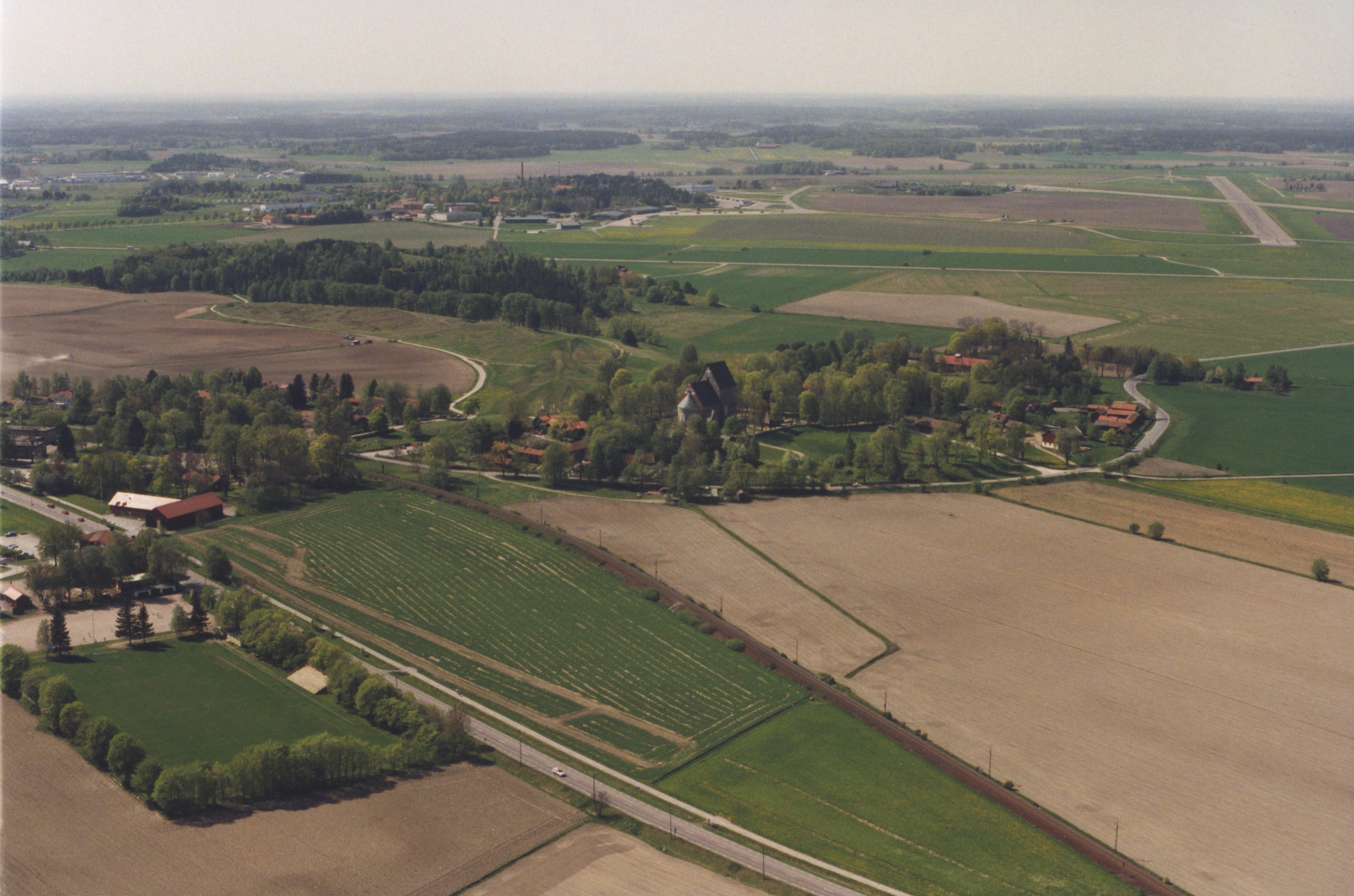 Beskrivning: Fyrisåns dalgång. Vid bildens mitt Gamla Uppsala kyrka RAÄnr Uppsala 774, Kungshögarna gravfält Uppsala 123:1, boplats Uppsala 263:1 m.fl. Bilden är tagen mot (väderstreck): SV