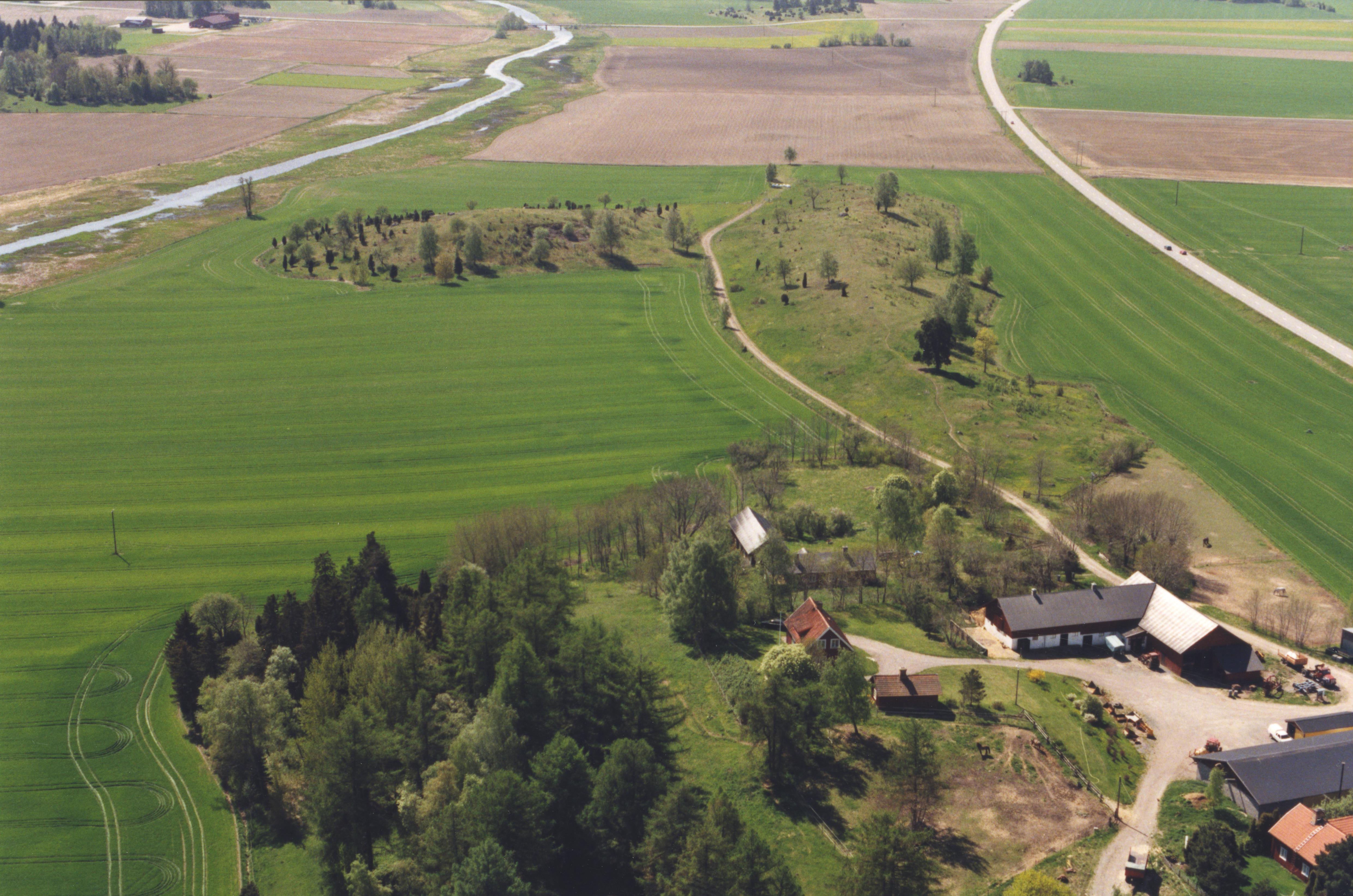 Beskrivning: Fyrisån vid Husby i Lena. I bildens nedre del bytomt RAÄnr Lena 833. Vid bildens mitt gravfälten RAÄnr Lena 140:1 och 141:1, högen Horsberget RAÄnr Lena 316:1 m.fl. I bildens övre del socknet Ärentuna. Bilden är tagen mot (väderstreck): SSV