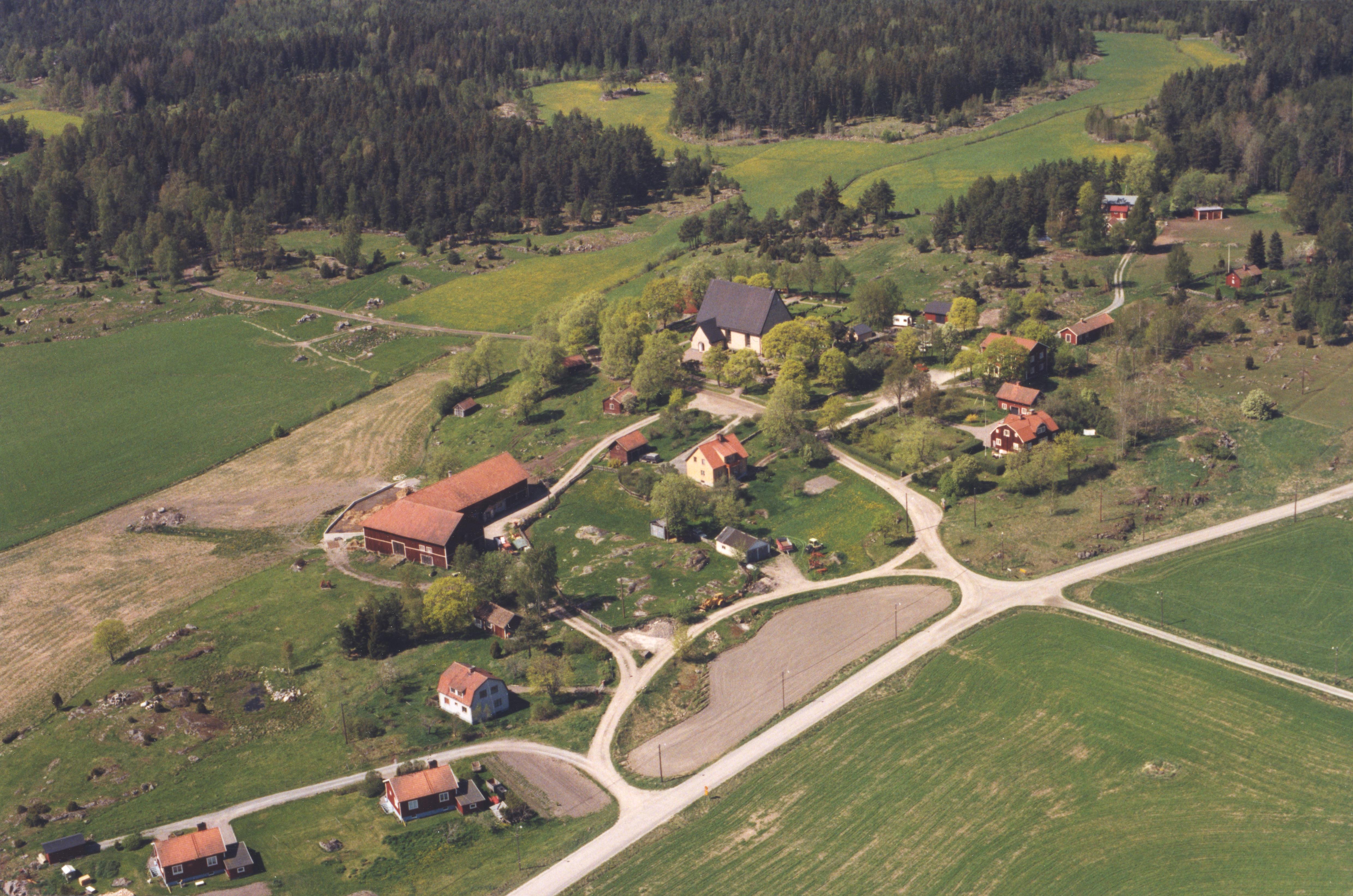 Beskrivning: Faringe kyrkby. Faringe kyrka över bildens mitt. Bilden är tagen mot (väderstreck): NV