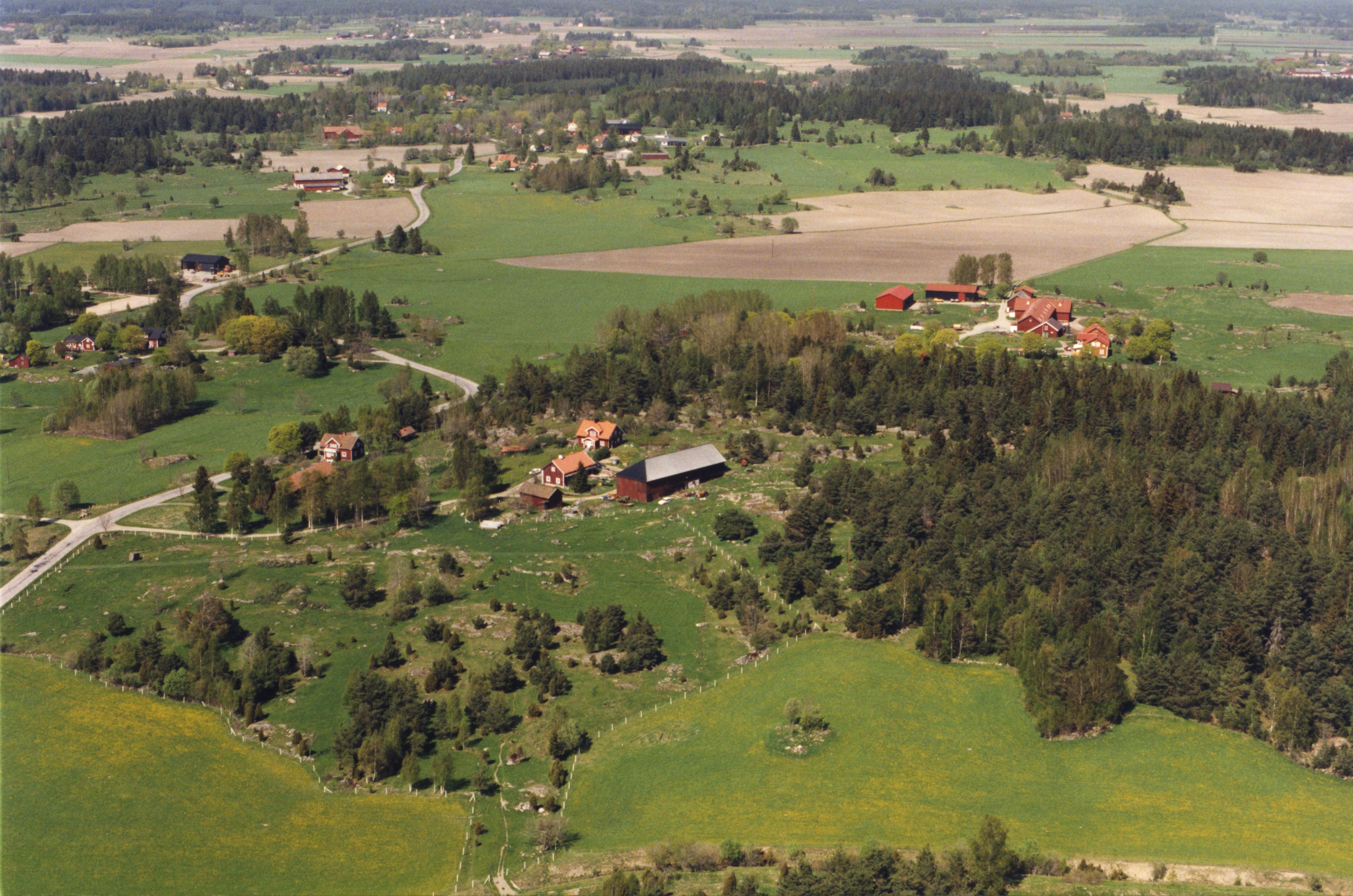 Beskrivning: Hammarby. Västergården med stensättning RAÄnr Alunda 64:1 till vänster över bildens mitt och Norrgården till höger. Södergården i bildens mitt. I bildens övre del byarna Källberga, Happsta, Spångby m.fl. Bilden är tagen mot (väderstreck): NNV