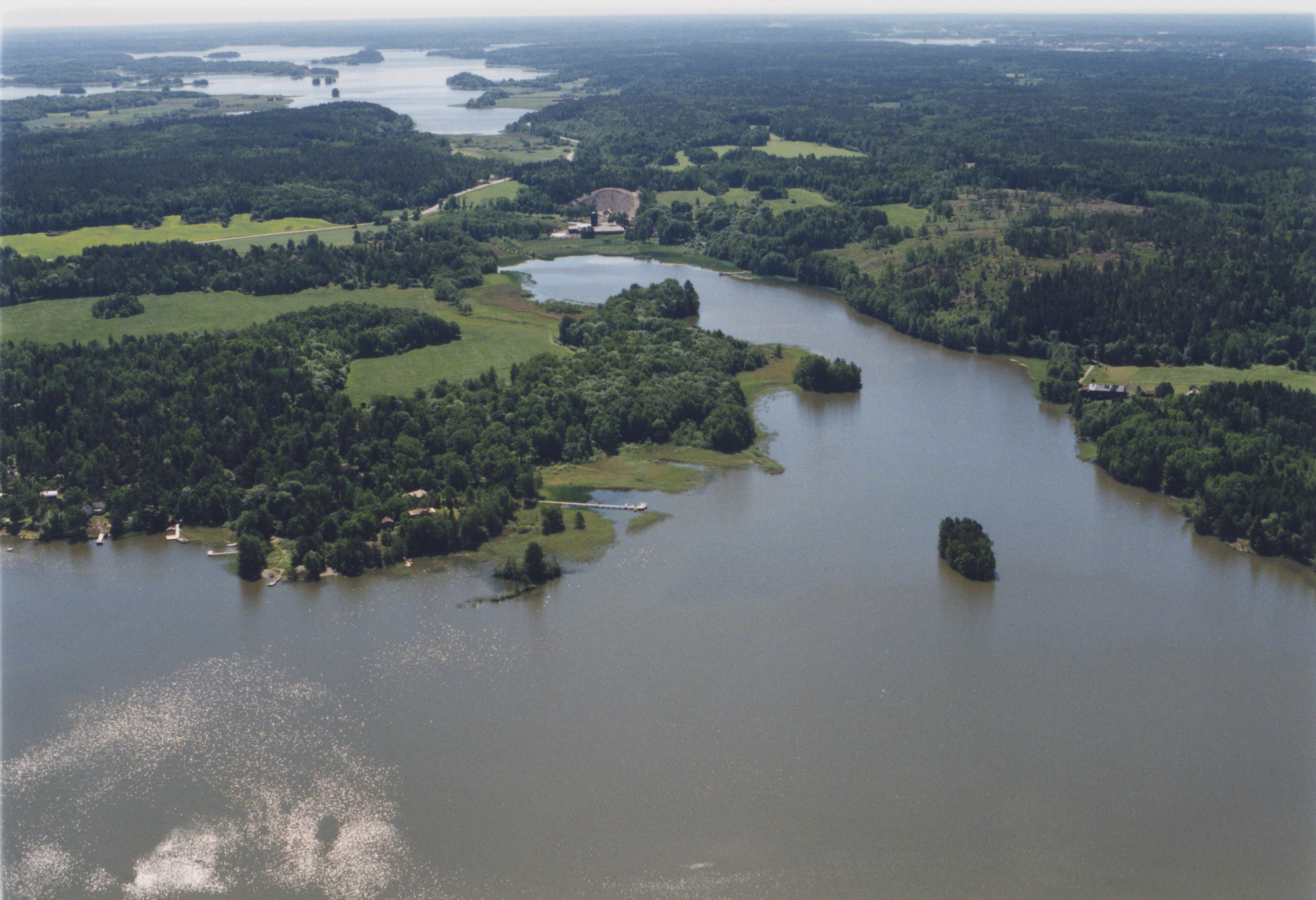 Beskrivning: Sjön Mälaren vid Tosterön / Aspön. Borgruin RAÄnr Aspö 106:1 vid Edebyviken vid bildens mitt. Uppe till vänster Edeby gård och Björndalsviken. Bilden är tagen mot (väderstreck): S