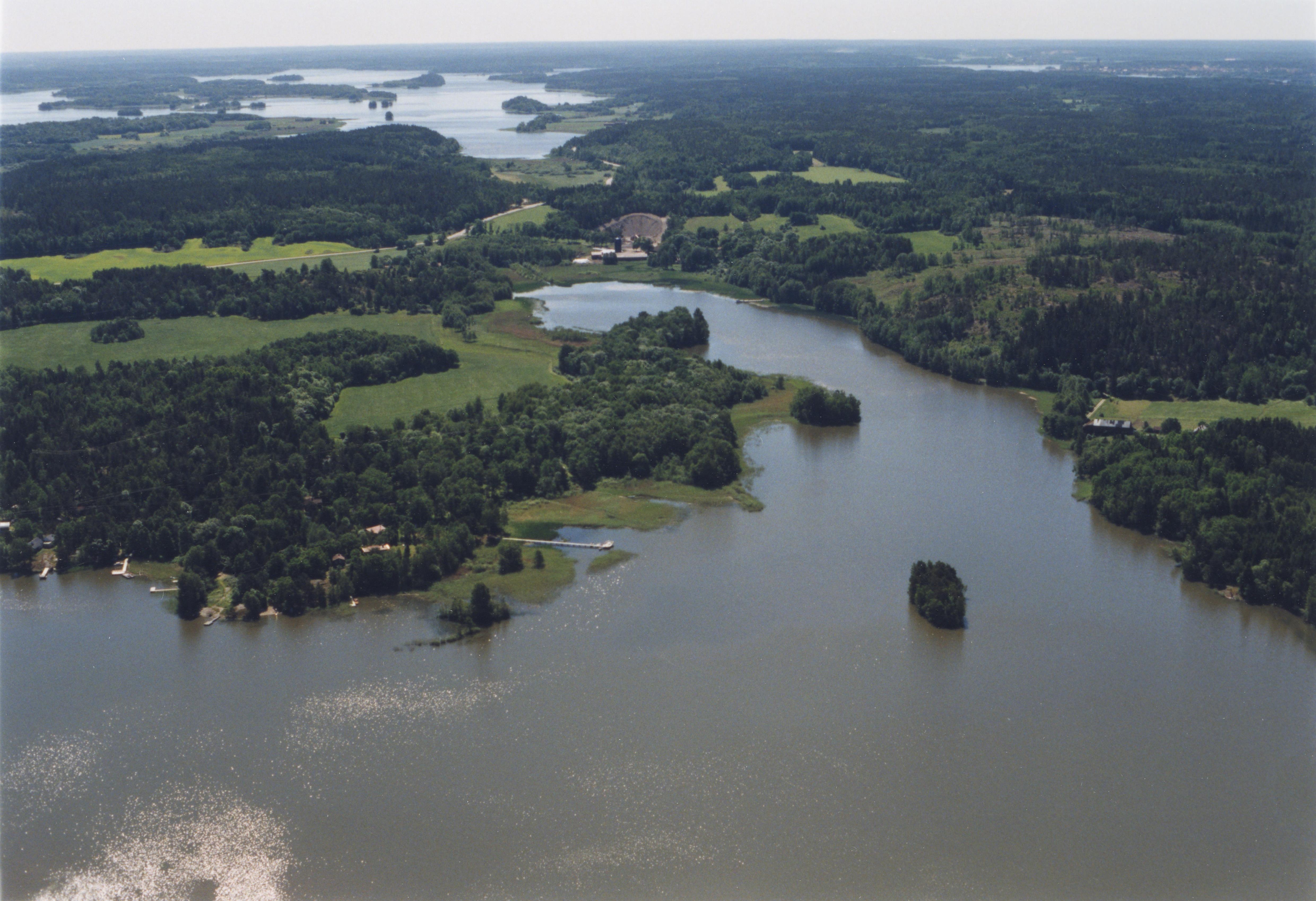 Beskrivning: Sjön Mälaren vid Tosterön / Aspön. Borgruin RAÄnr Aspö 106:1 vid Edebyviken vid bildens mitt. Uppe till vänster Edeby gård och Björndalsviken. Bilden är tagen mot (väderstreck): S