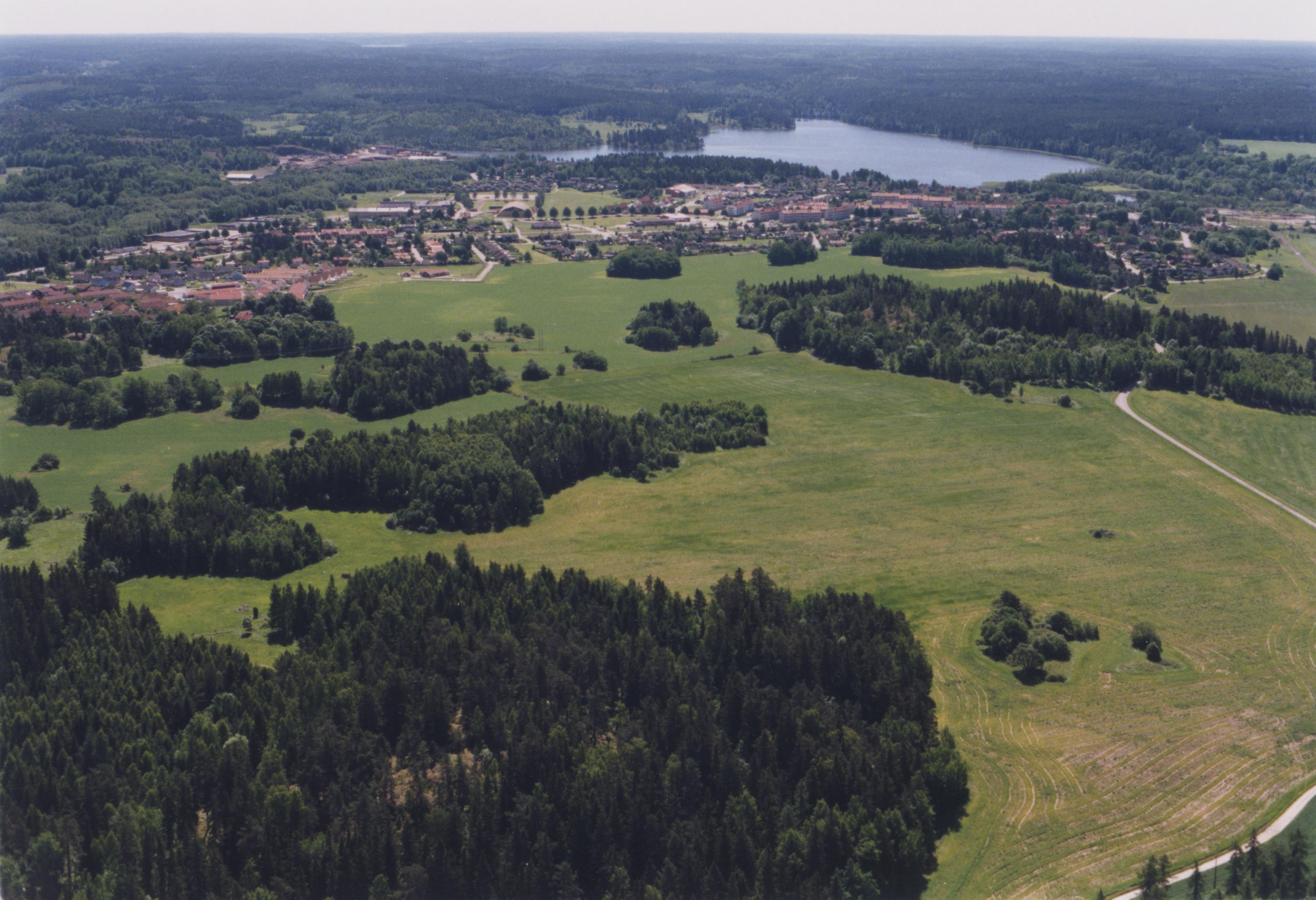 Beskrivning: Vid bildens mitt Skämby gamla tomt RAÄnr Åker 438:1. I bildens övre del Åkers styckebruk vid Råcksta å och sjön Visnaren. Bilden är tagen mot (väderstreck): S