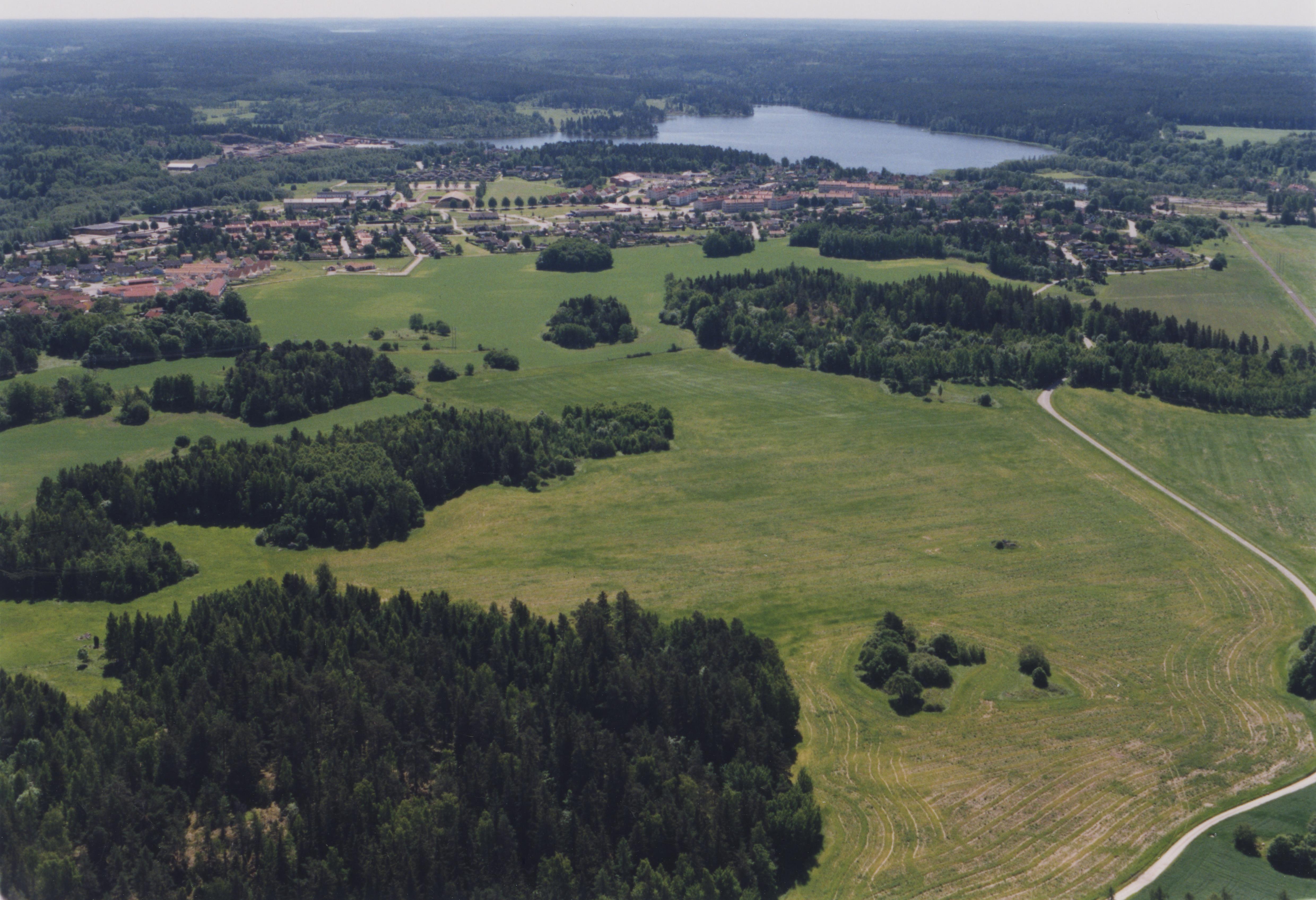 Beskrivning: Vid bildens mitt Skämby gamla tomt RAÄnr Åker 438:1. I bildens övre del Åkers styckebruk vid Råcksta å och sjön Visnaren. Bilden är tagen mot (väderstreck): S