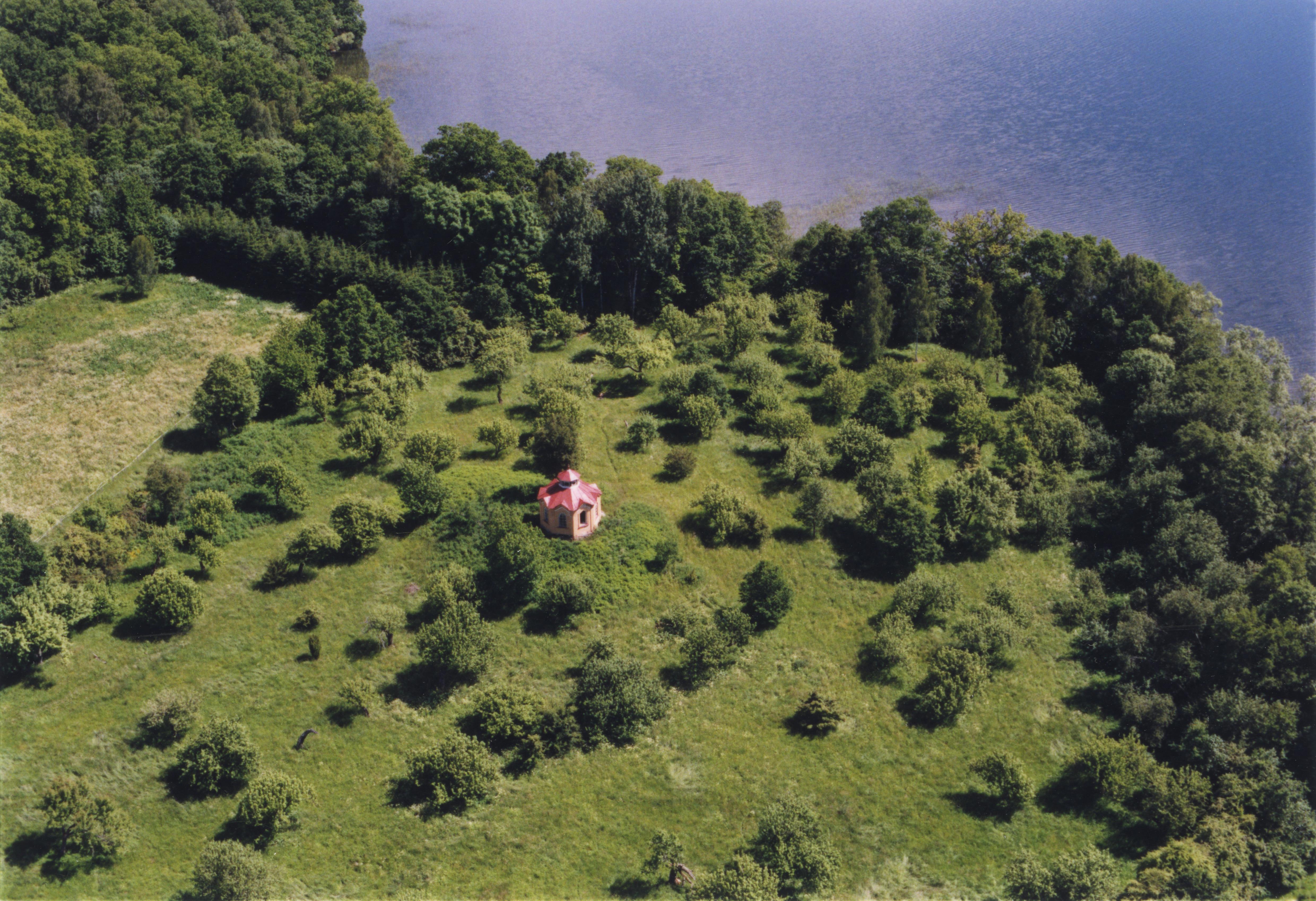Beskrivning: Stora Vassviken i norra delen av Djurön, vid Gullfjärden i sjön Båven. Område med liten byggnad (lusthus?) norrost om gravfältet ?Prinsens gravbacke? RAÄnr Årdala 122:1. Bilden är tagen mot (väderstreck): Ö