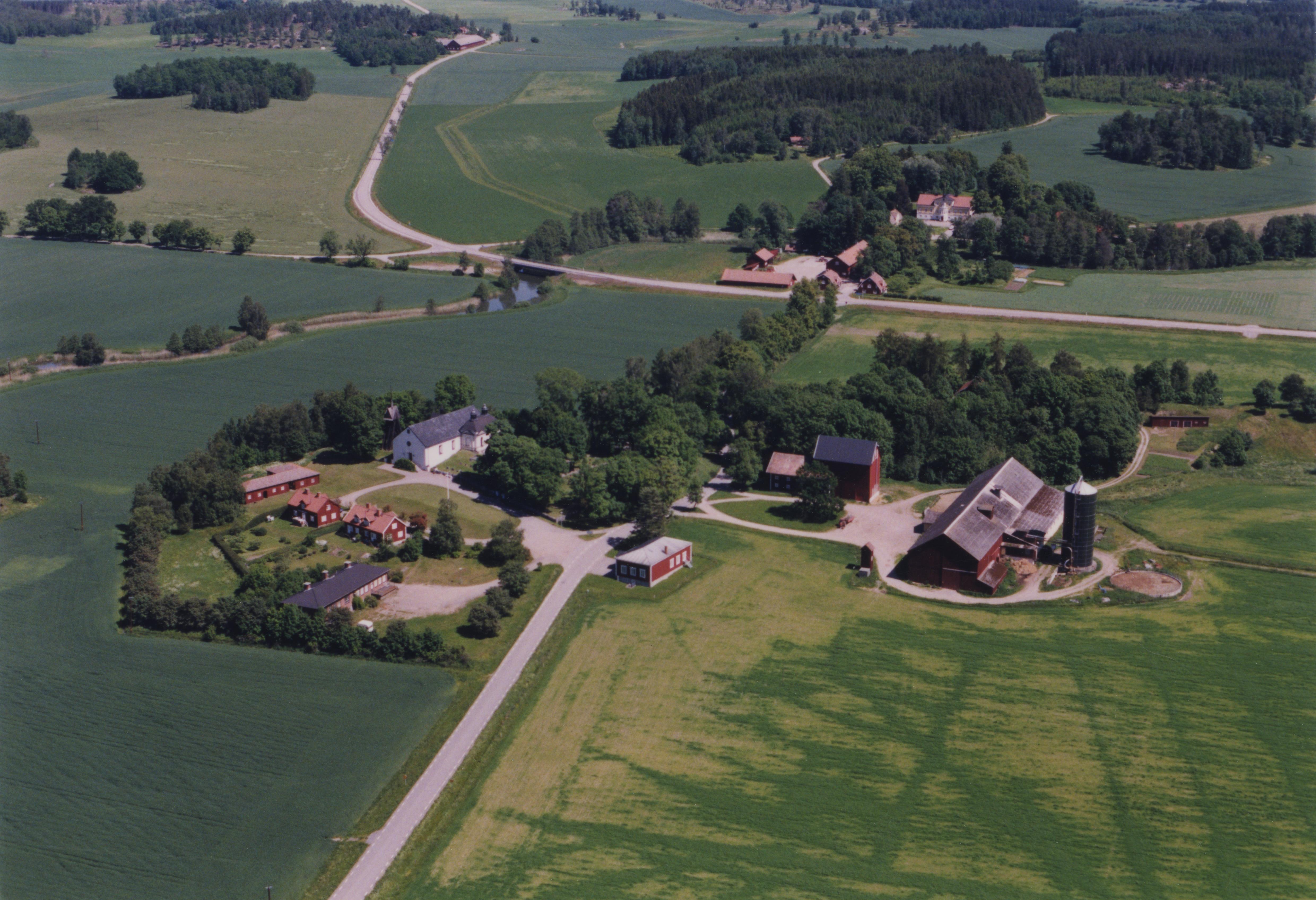 Beskrivning: Husby-Oppunda kyrka till vänster om bildens mitt. Vid kyrkan bytomt RAÄnr Husby-Oppunda 253:1. I bildens övre del Husbyån vid herrgården Husbygård. Bilden är tagen mot (väderstreck): NO