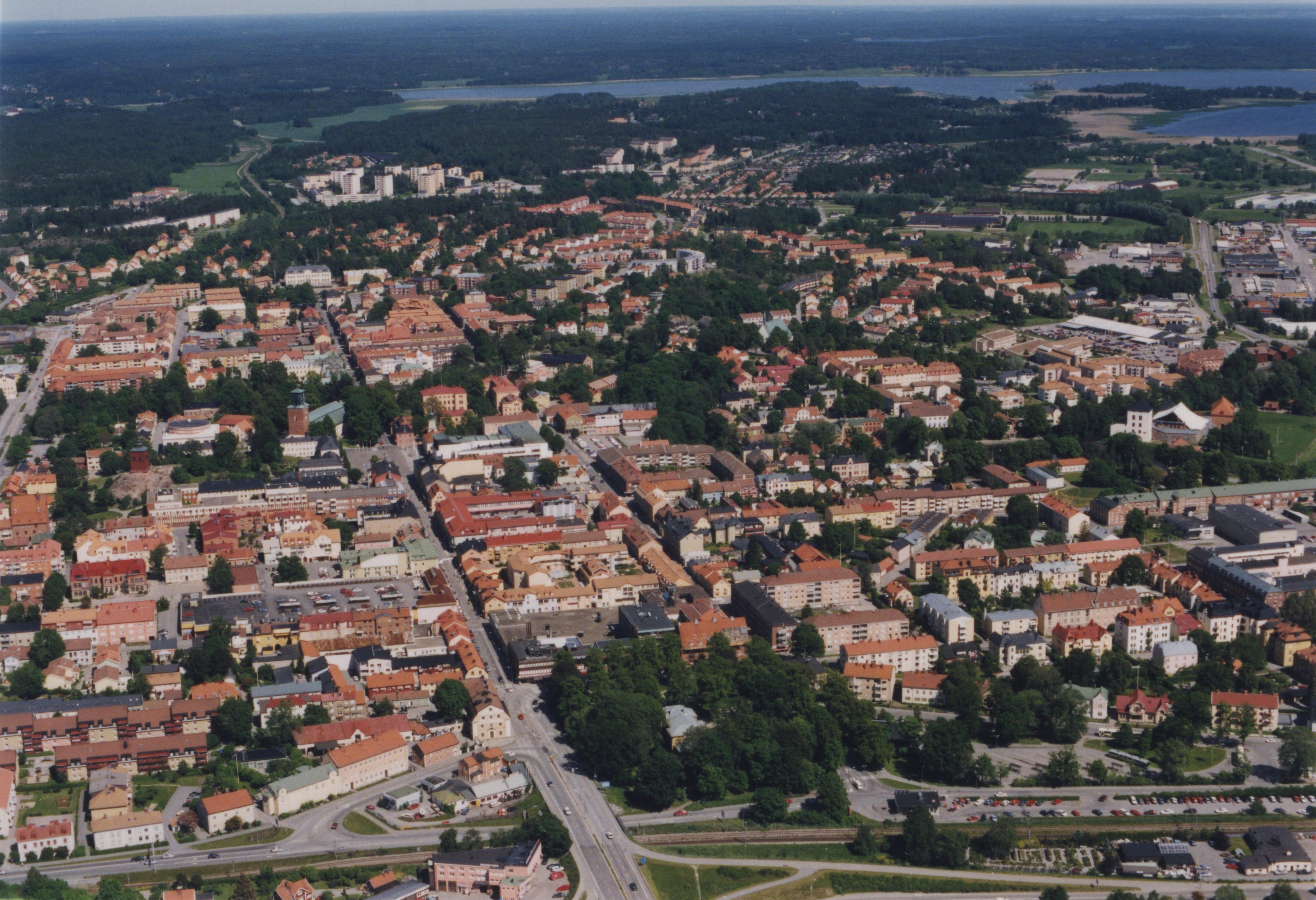 Beskrivning: Nyköpings stad, stadsdelen Väster. Till vänster Västra Storgatan, Stora Torget och Sankt Nicolai kyrka. Till höger Nyköpingshus RAÄnr Nyköping 64:1 vid Nyköpingsån. Bilden är tagen mot (väderstreck): Ö