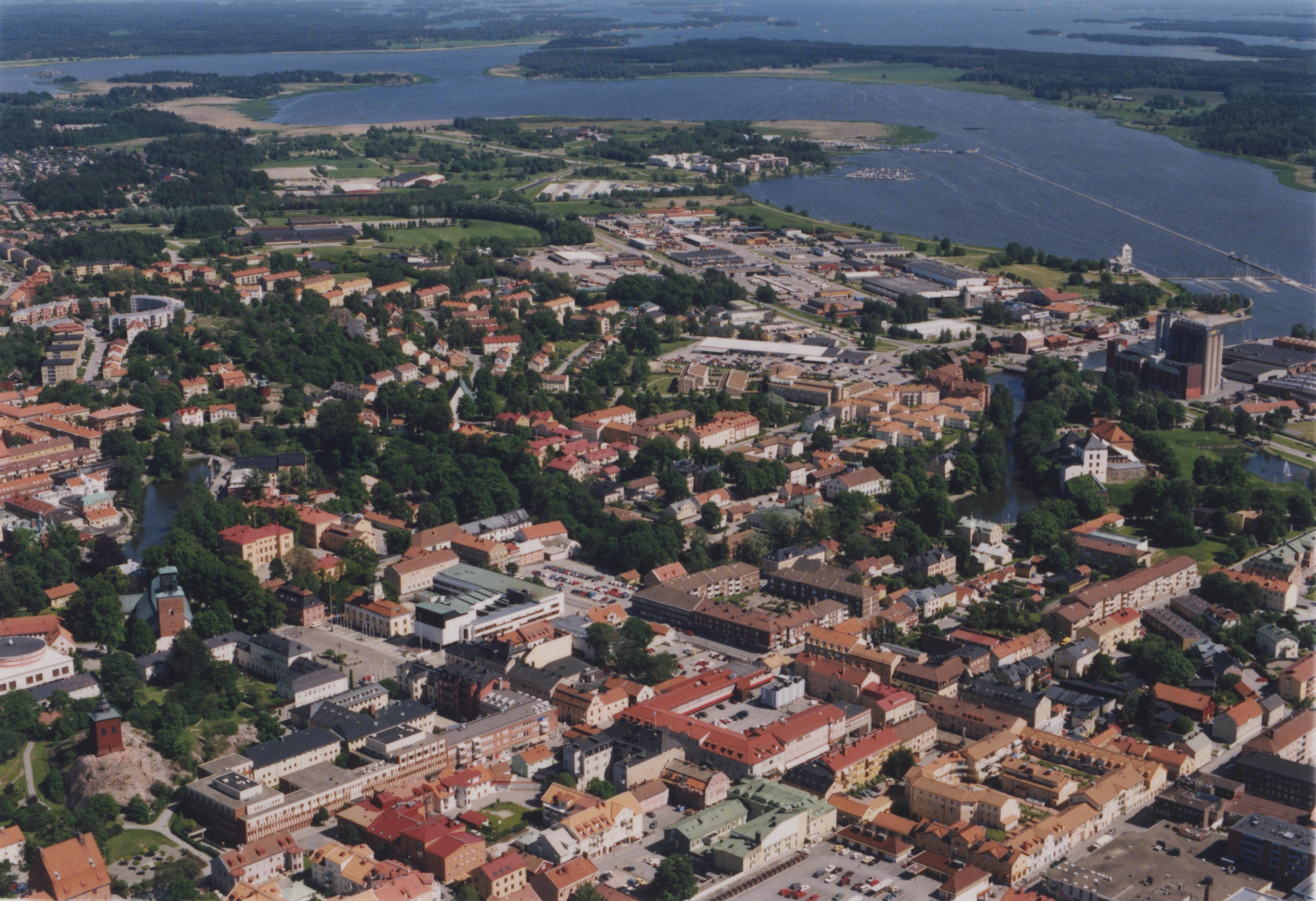 Beskrivning: Nyköpings stad, södra delen. Alla Helgona kyrka till vänster om bildens mitt. Sankt Nicolai kyrka vid Stora Torget nere till vänster. Till höger borgen Nyköpingshus RAÄnr Nyköping 64:1 vid Nyköpingsån. Bilden är tagen mot (väderstreck): SO