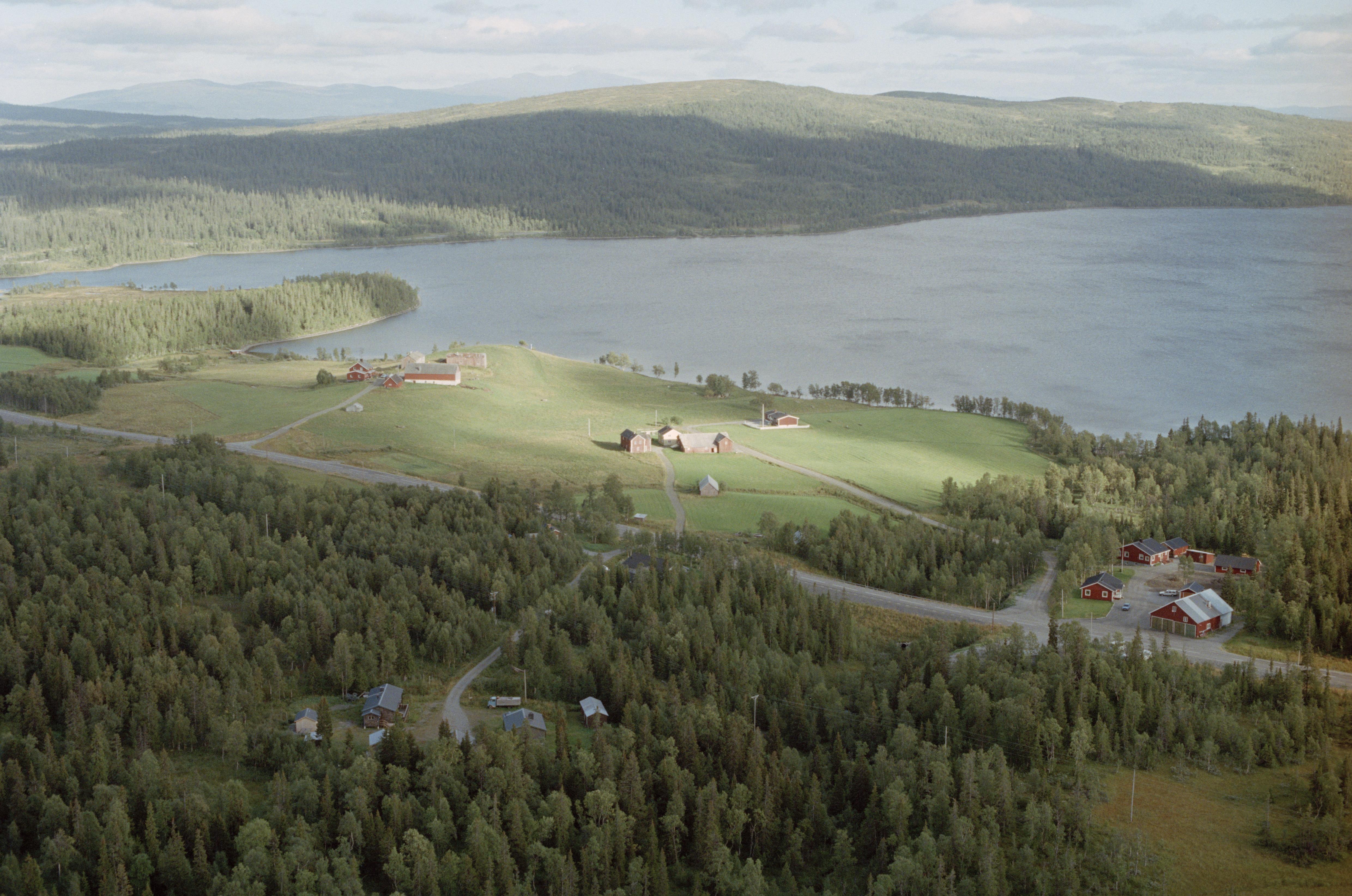 Beskrivning: I bildens nedre del Skalstugevägen och pilgrimsleden Sankt Olavsleden vid byn Saxvallen på nordsidan av Medstugusjön. Vid stranden i bildens övre del (sjöns östsida) bro RAÄnr Åre 467:1. Bilden är tagen mot (väderstreck): SSO