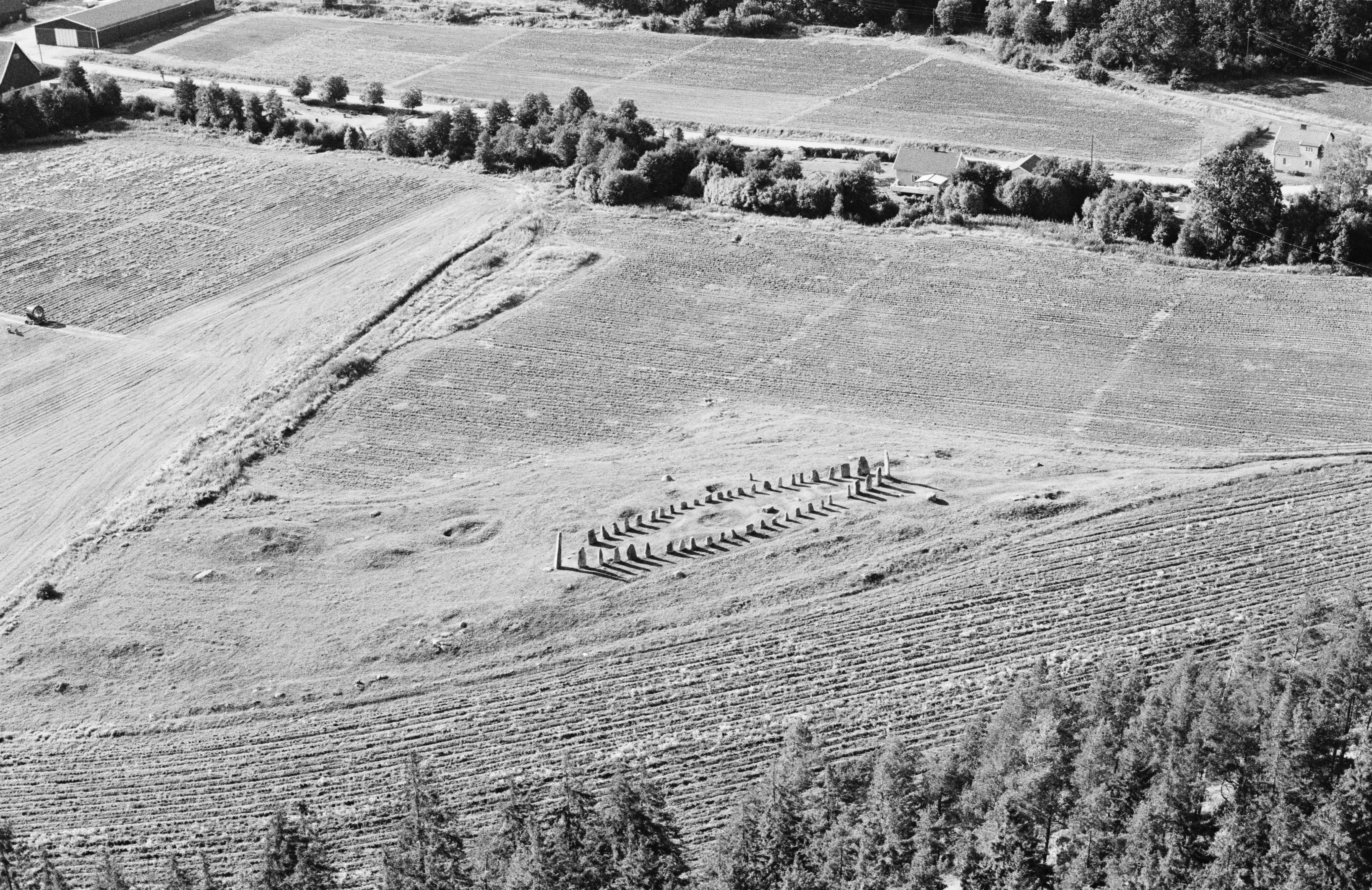 Beskrivning: Blomsholms by och herrgård. Gravfält med skeppssättning RAÄnr Skee 343:1 och hällristning Skee 1563:1 till höger om bildens mitt. Bilden är tagen mot (väderstreck): V