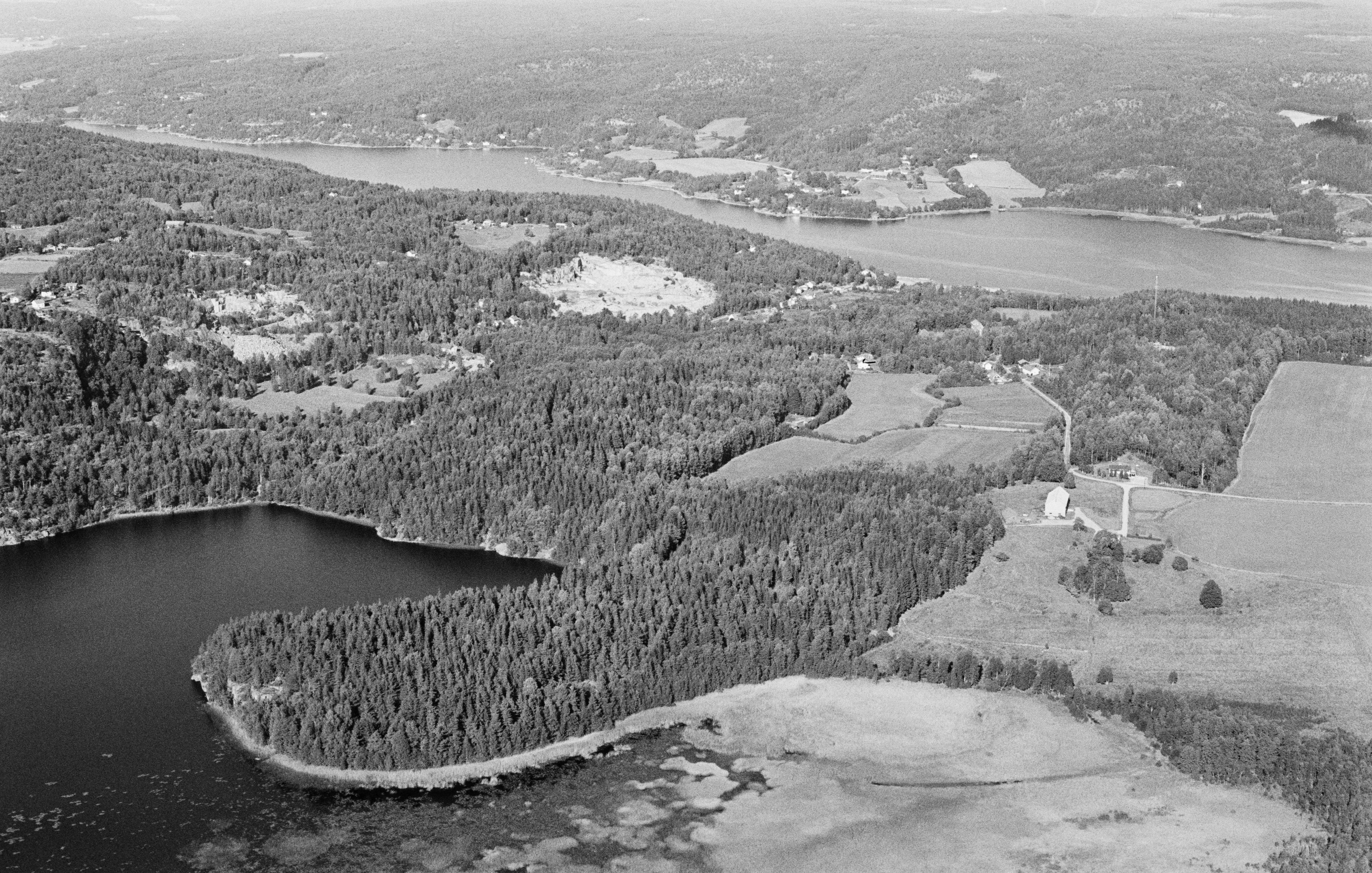 Beskrivning: Krokstrands stenhuggarsamhälle vid Idefjorden. Hög RAÄnr Skee 412:1-3 och hällristning Skee 650:1 vid bildens mitt. Kroktjärnet nere till vänster.. Bilden är tagen mot (väderstreck): NO