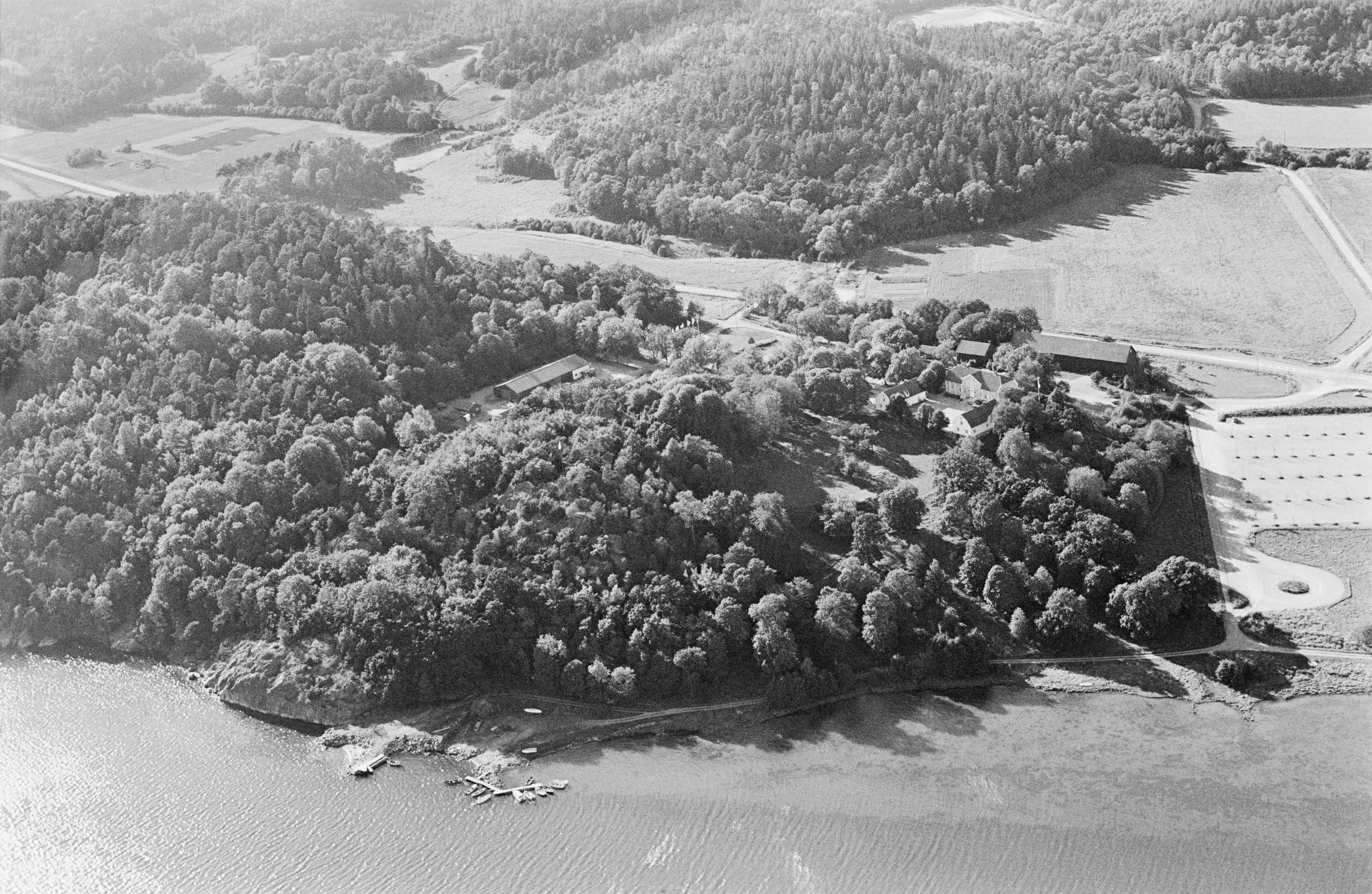 Beskrivning: Åby herrgård / säteri. Byggnadsminne RAÄnr Tossene 335:1. Fornlämningsområde vid gränsen mot Bro socken i Åbyfjorden. Vägmärke RAÄnr Tossene 687:1. Bilden är tagen mot (väderstreck): NV