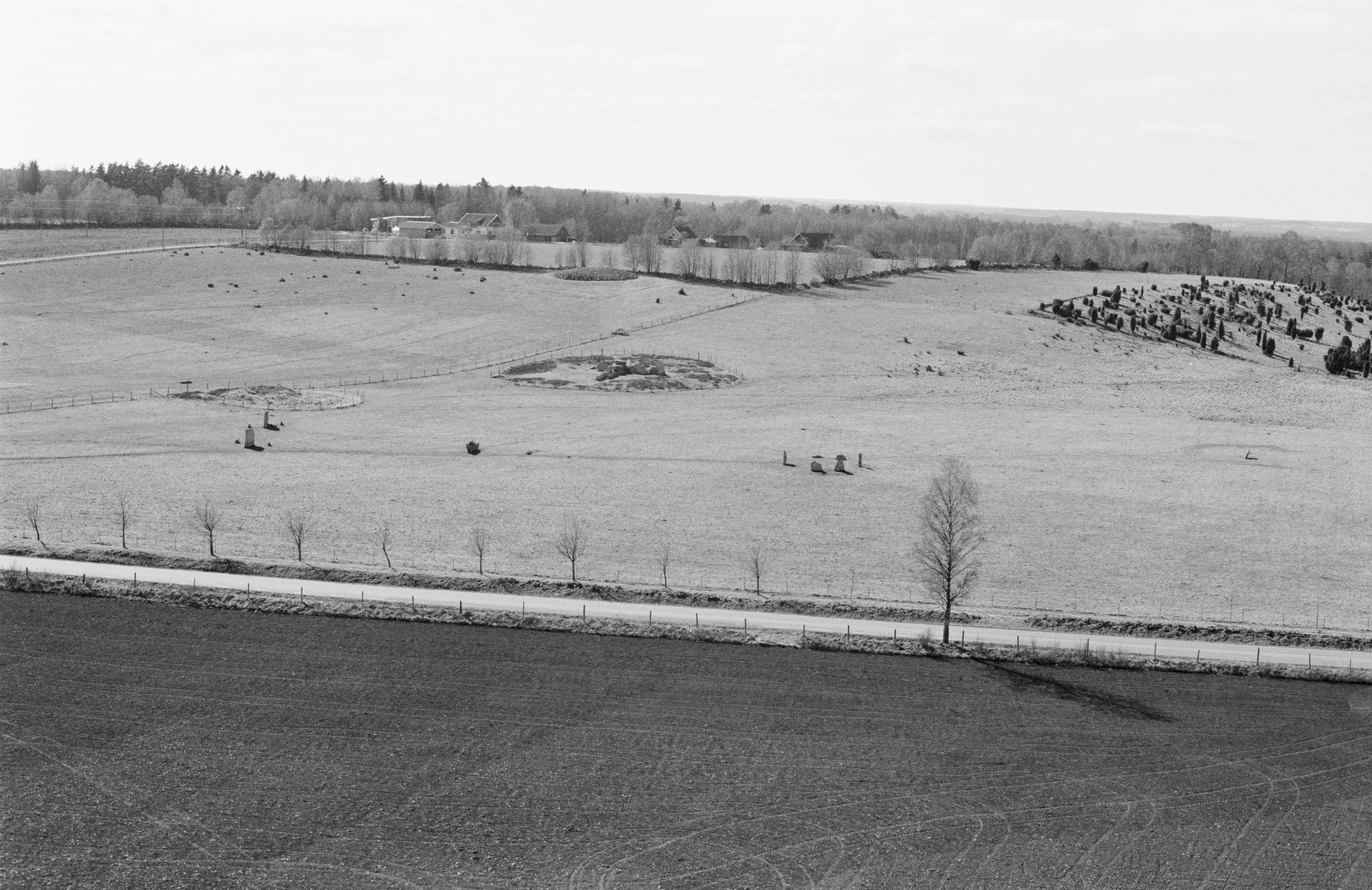 Beskrivning: Gravfält, hällristningar, röse m.m. RAÄnr Hornborga 22:1, 27:1-4, 29:1-3, 31:1-5 (stenkammargrav Gigerugnen / Girommen med hällristningar och stenkrets), 32:1-2 m.fl. Bilden är tagen mot (väderstreck): SV