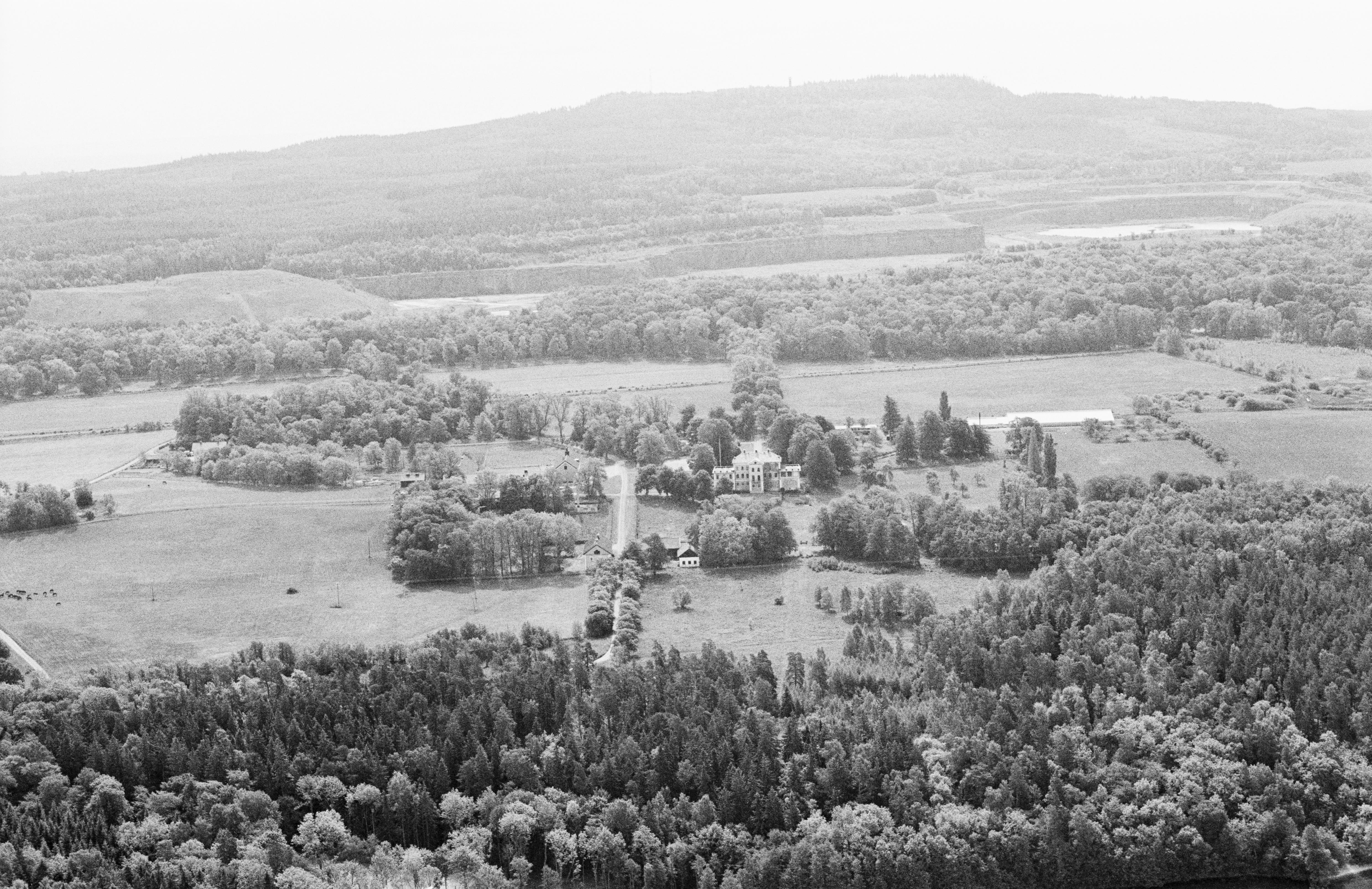 Beskrivning: Hellekis herrgård / säteri (skrivs även Hällekis). I bildens övre del Kinnekulle utsiktstorn på Högkullen vid Österplana socken. Bilden är tagen mot (väderstreck): SO