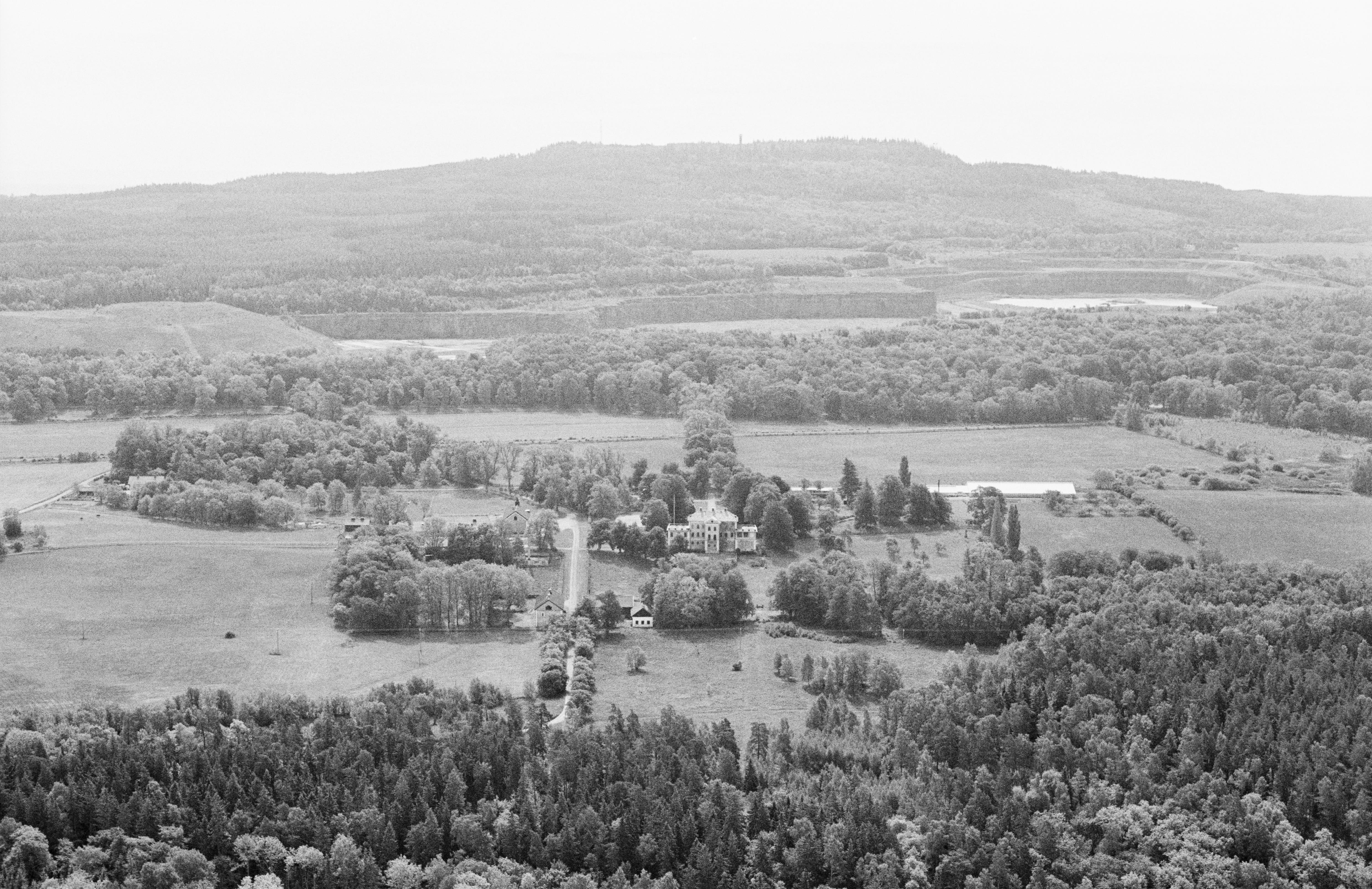 Beskrivning: Hellekis herrgård / säteri (skrivs även Hällekis). I bildens övre del Kinnekulle utsiktstorn på Högkullen vid Österplana socken. Bilden är tagen mot (väderstreck): SO