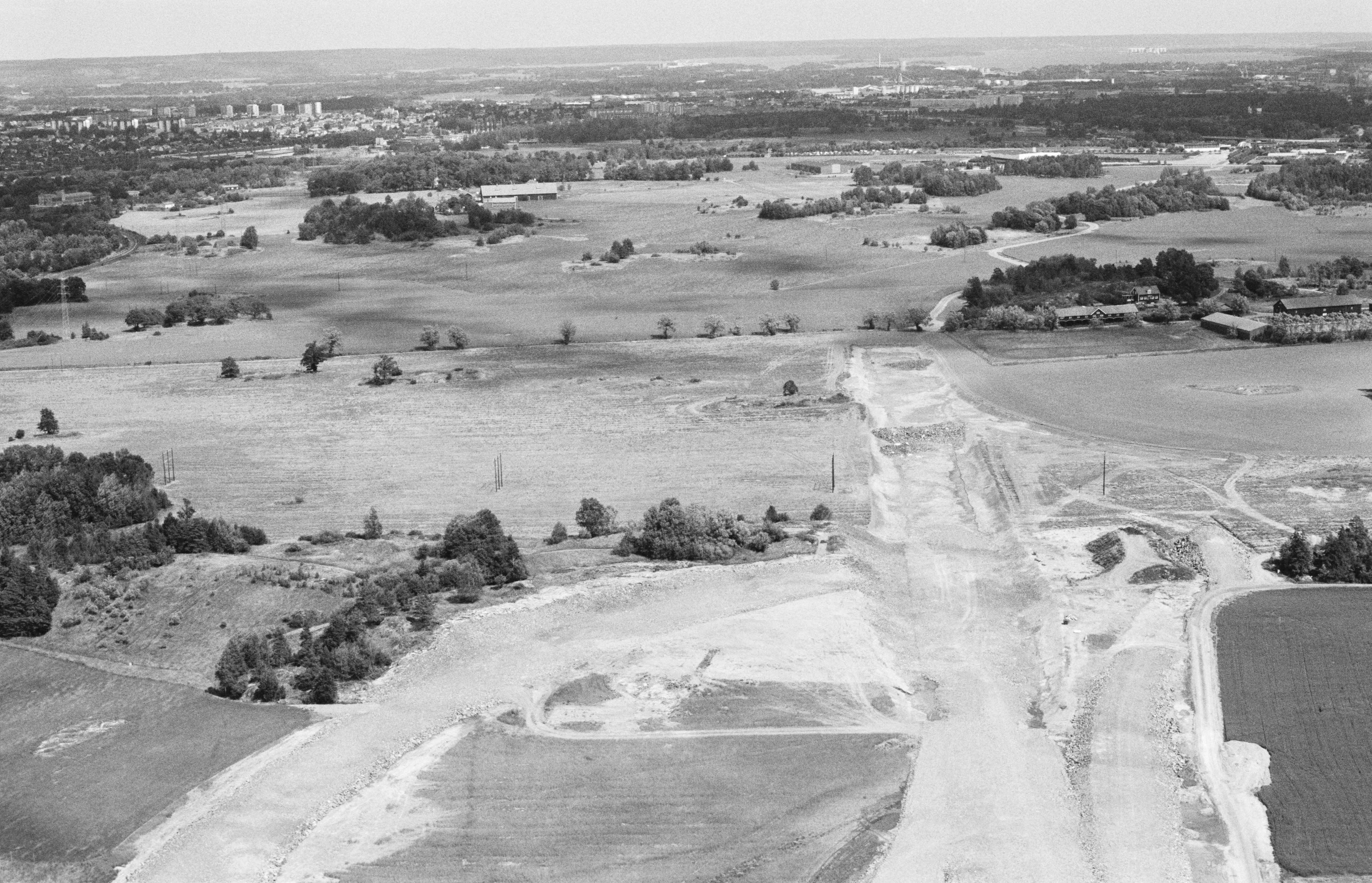 Beskrivning: (Tid. Borgs socken). Bygge av väg E4 genom hällristningsområde RAÄnr Borg 23:1, 24:1, 25:1, 26:1-2, 27:1 m.fl. Borgs säteri och Skälvs gård. I bildens övre del Norrköpings stad. Bilden är tagen mot (väderstreck): NO