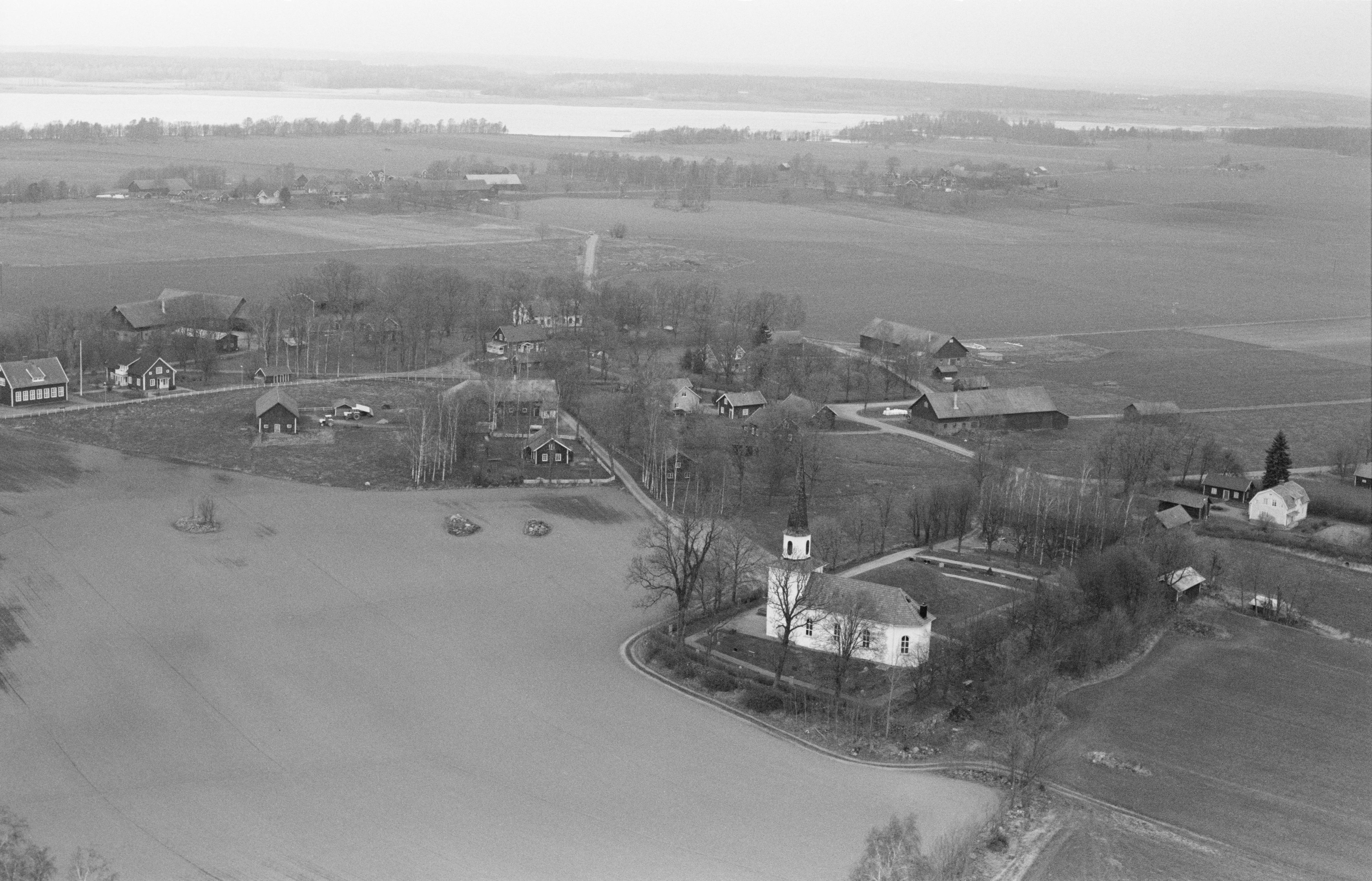 Beskrivning: Flistads kyrka framför storhögen "kung Ranes hög" RAÄnr Flistad 12:1. Bilden är tagen mot (väderstreck): NNO