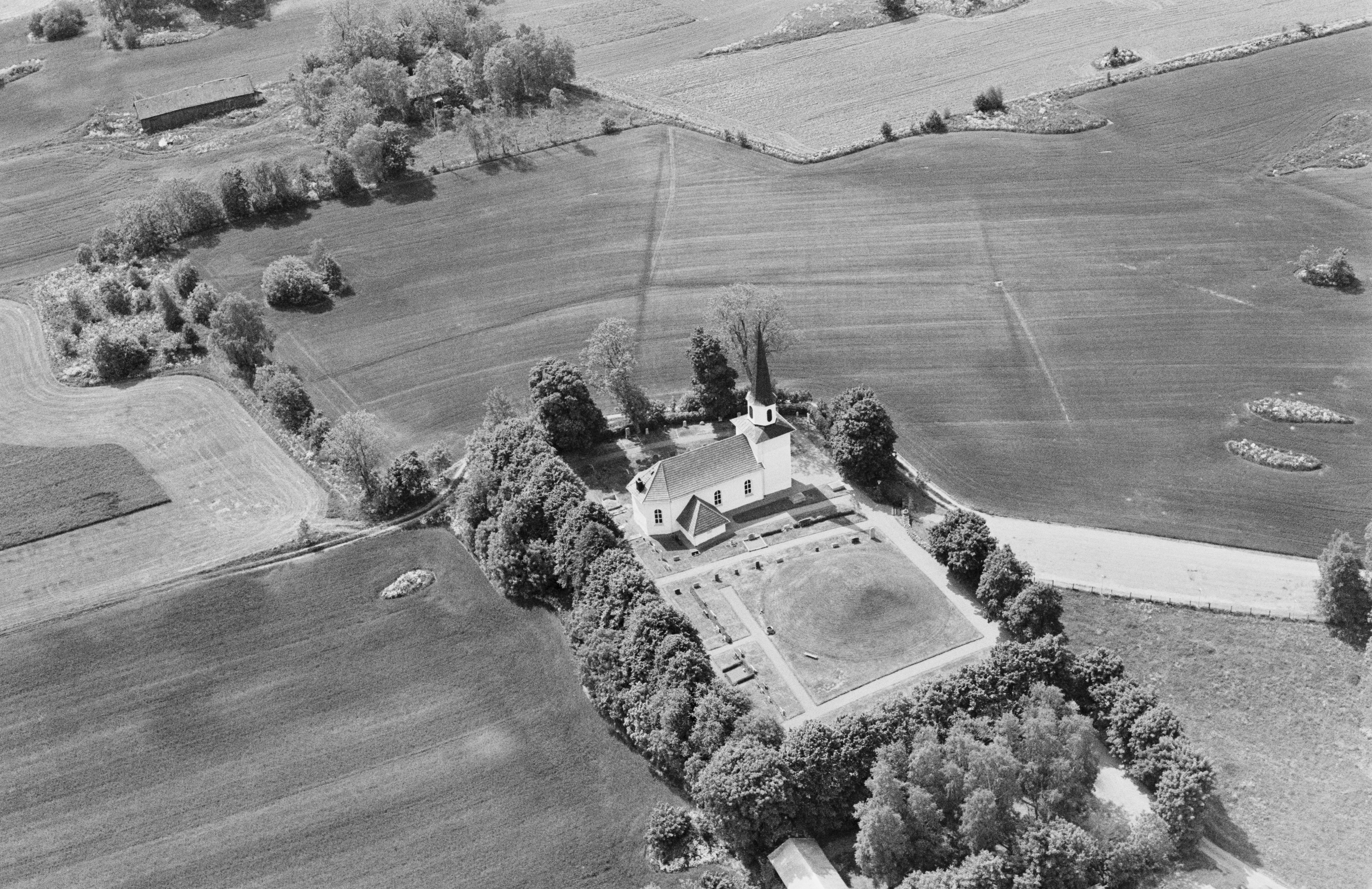 Beskrivning: Flistads kyrka och storhögen "kung Ranes hög" RAÄnr Flistad 12:1. Bilden är tagen mot (väderstreck): SV