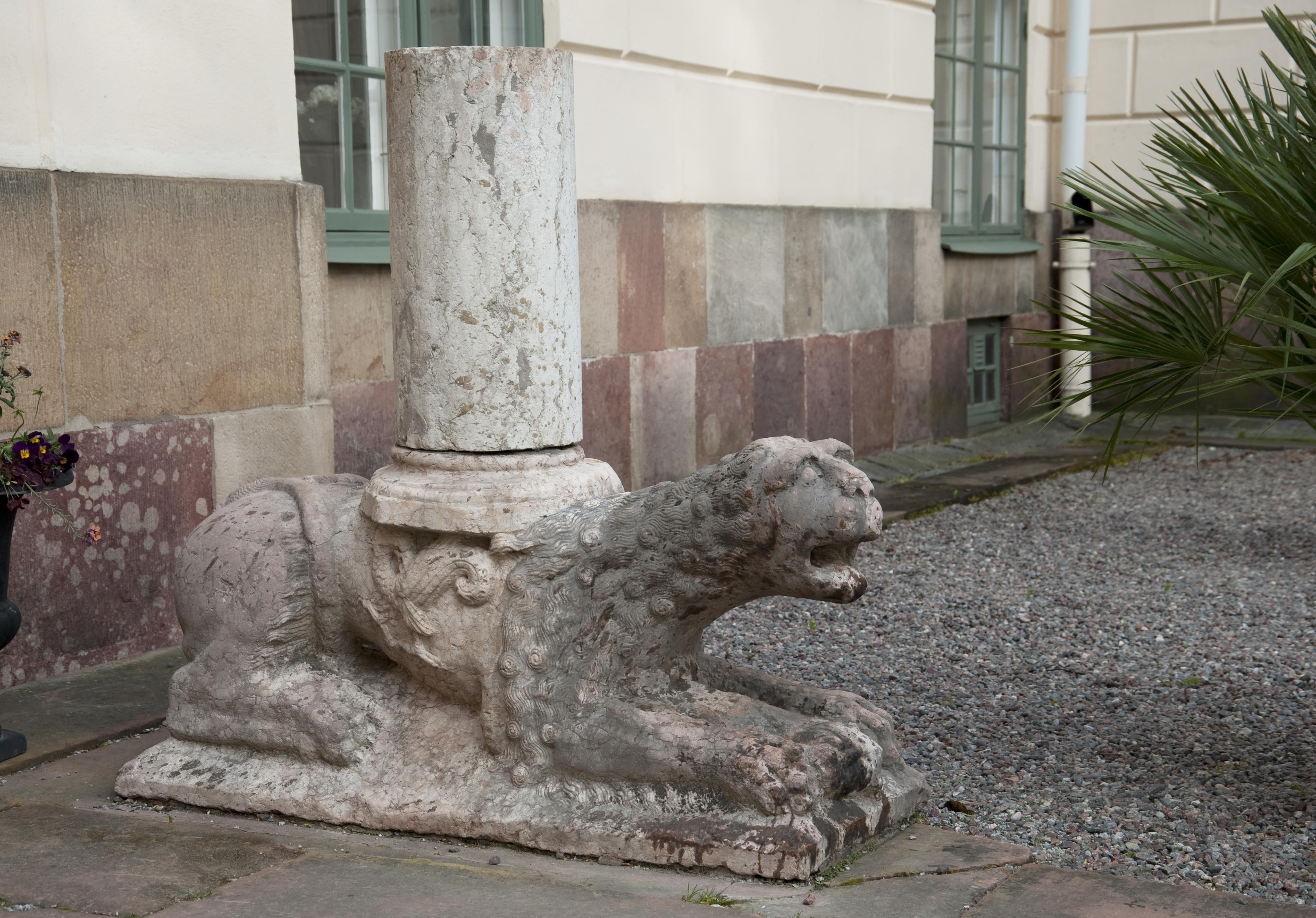 Beskrivning: Urnhållare, lejon med kolonn och urna på ryggen vid entrén