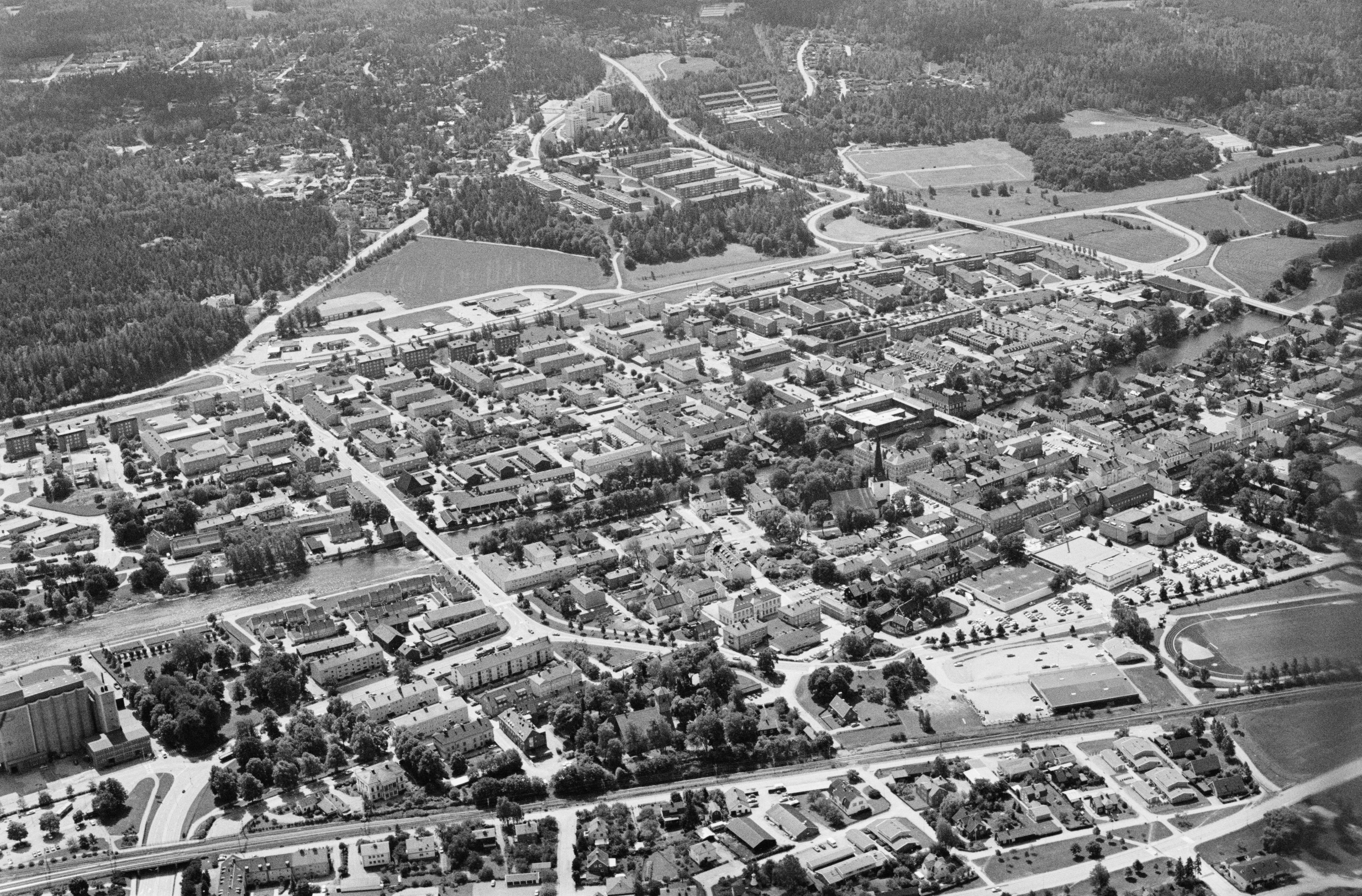 Beskrivning: Arboga stad vid Arbogaån. Stadslager RAÄnr Arboga stad 34:1. Nere till vänster Sankt Nikolai kyrka. Heliga Trefaldighetskyrka vid bildens mitt. Bilden är tagen mot (väderstreck): SV