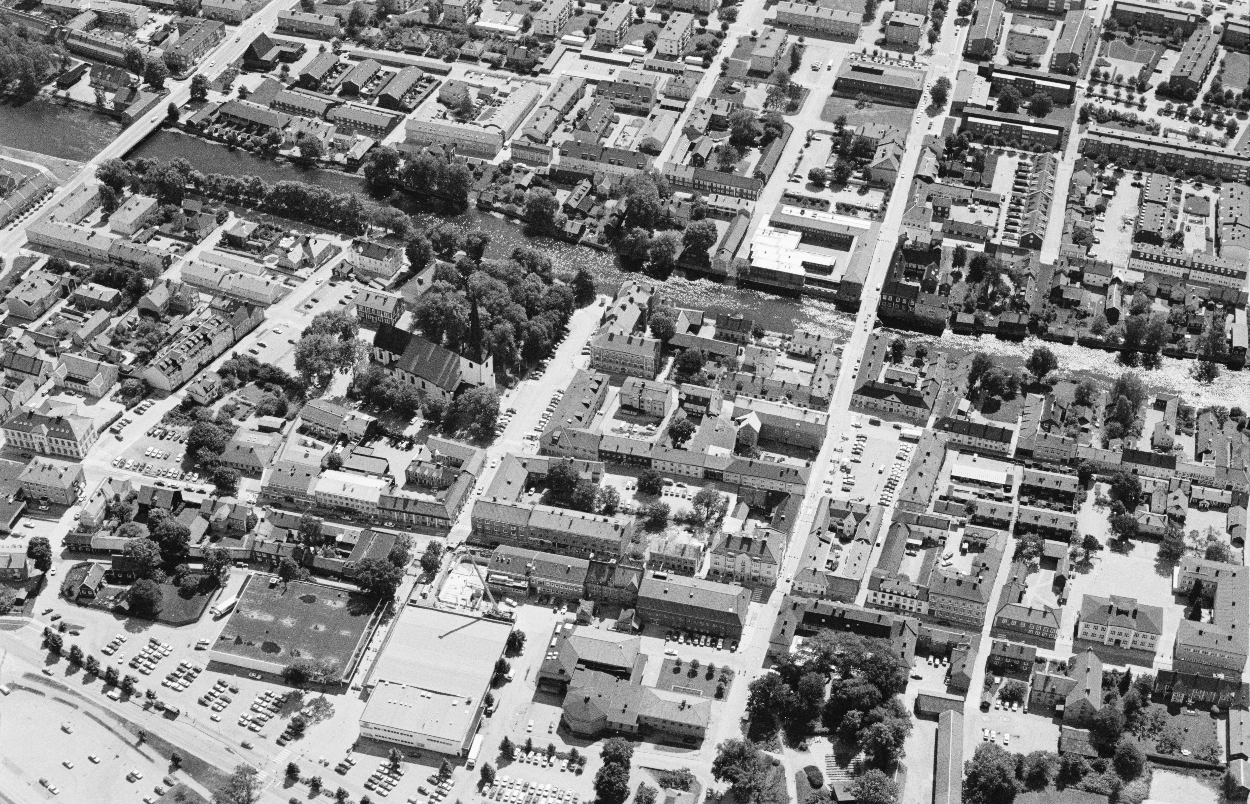 Beskrivning: Arboga stad vid Arbogaån. Heliga Trefaldighetskyrka i stadslager RAÄnr Arboga stad 34:1 till vänster om bildens mitt. Bilden är tagen mot (väderstreck): SSO